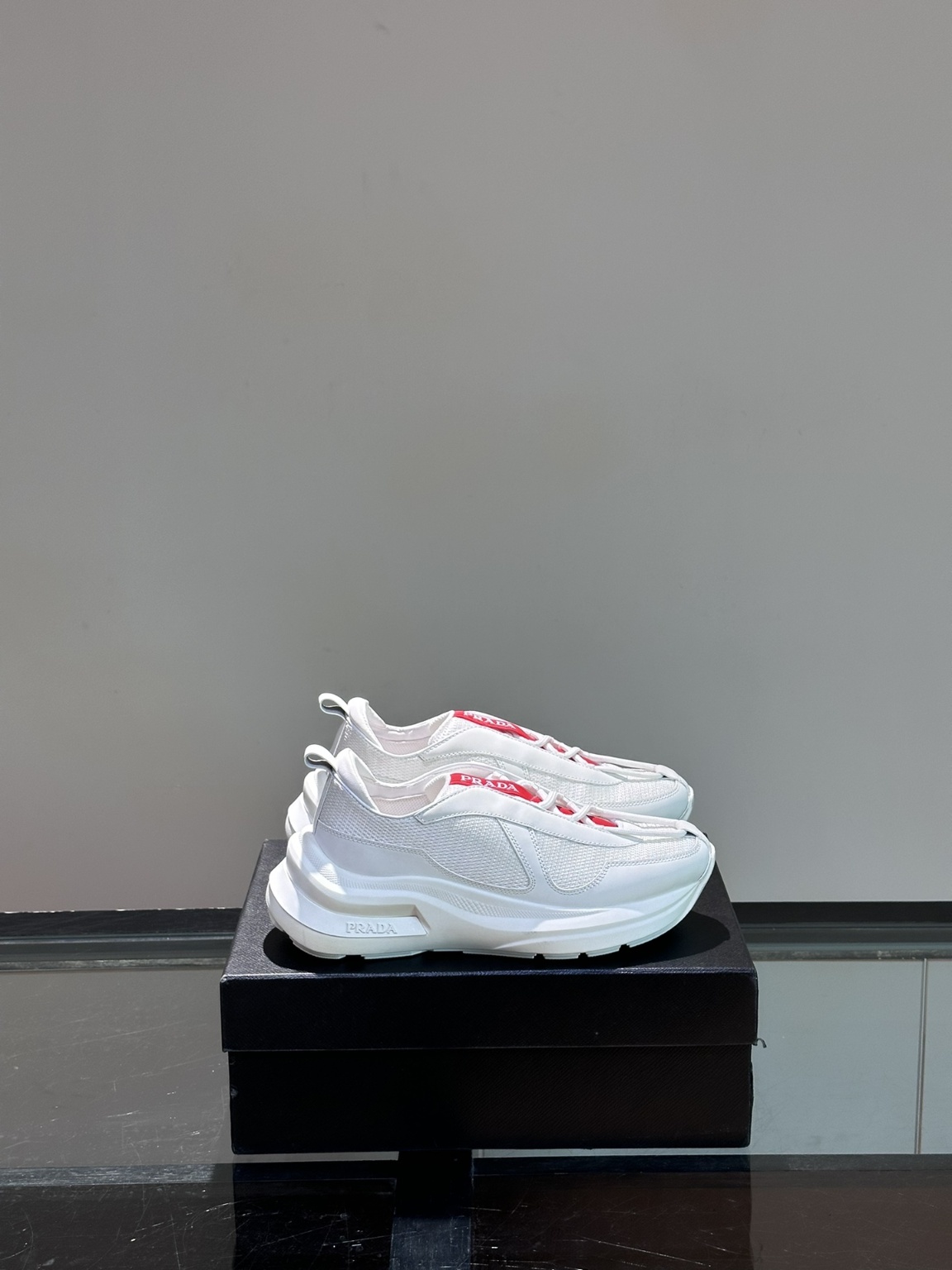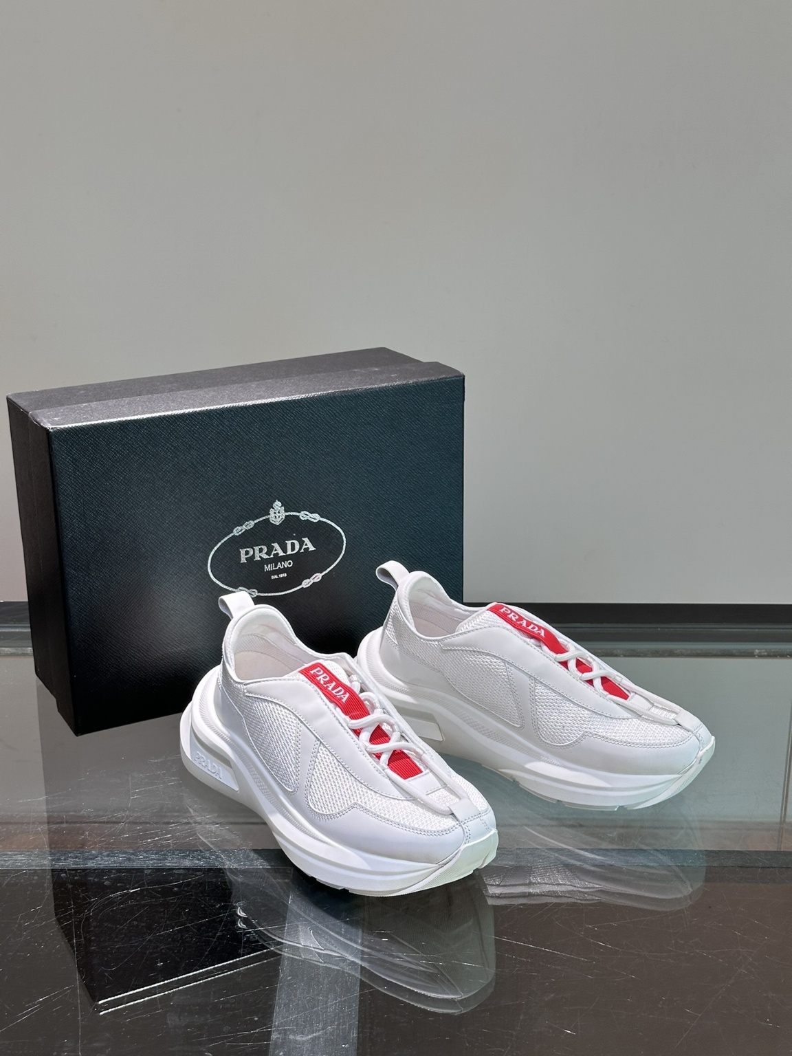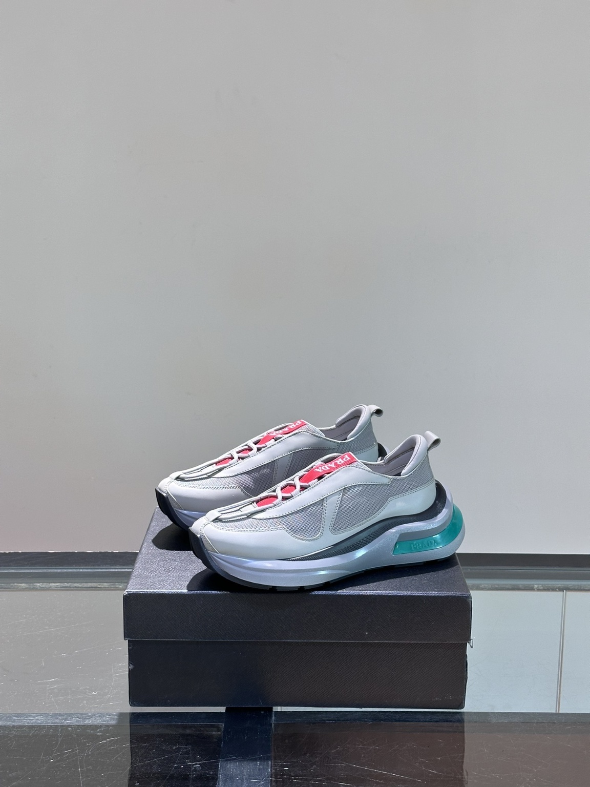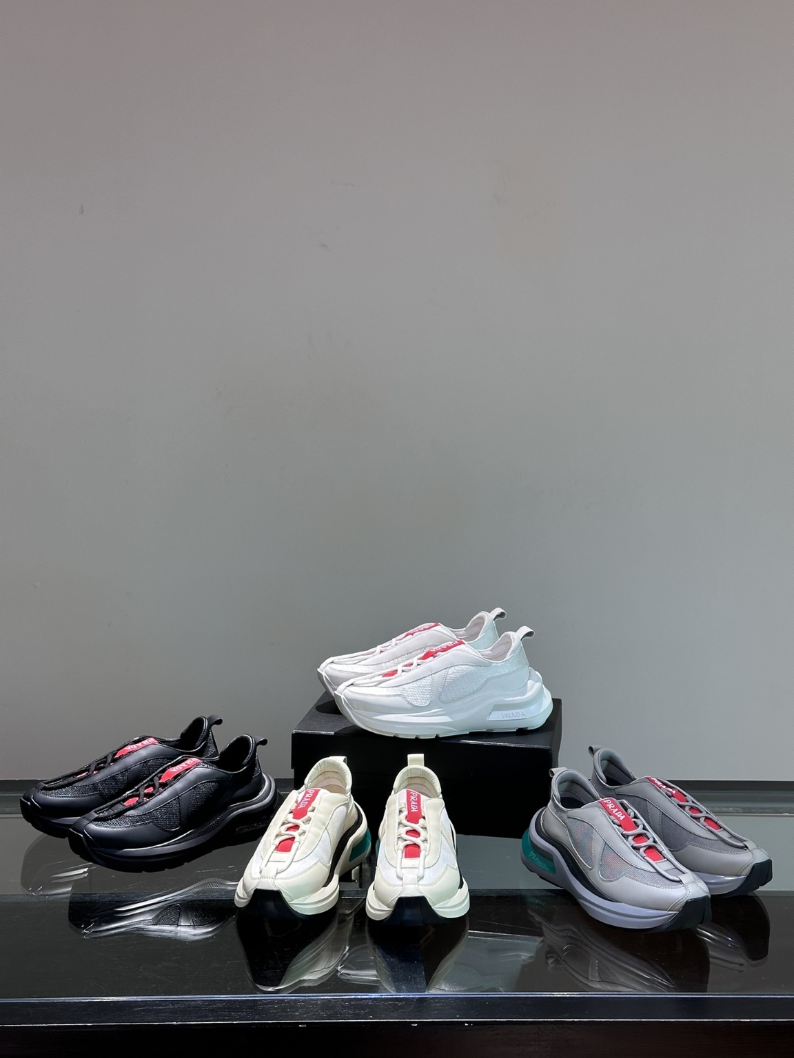 프라다의 남성용 새로운 유광 가죽 패치워크 운동화 컬렉션 스타일을 현대적인 컨셉으로 재해석한 운동화 소가죽 패치 컬러의 패브릭 메쉬 면으로 제작 앞코와 뒤꿈치가 소가죽으로 감싸여져 있으며 히든 스트랩 디자인으로 미니멀하고 아담한 느낌을 주며 수작업으로 꿰맨 볼록한 고무 가장자리로 장인정신 공법 측면 스크린 프린팅 로고, 후면 팽창고무 삼각형과 대비효과 초경량 6cm 고무창, 패션 아이템으로 추천함
