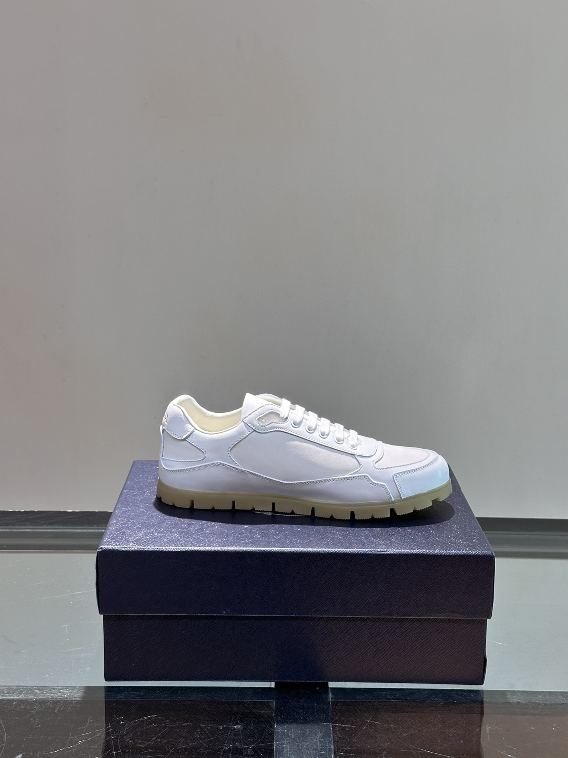 프라다의 남성용 새로운 가죽 스니커즈 매끈한 라인과 스포티한 에너지와 미니멀한 라인이 조화를 이루어 현대적인 매력을 표현해 주는 세련된 운동화 소가죽 소재에 가볍고 슬림한 러버솔과 혀와 굽에 이니셜 로고를 엠보싱하고 속굽이 소가죽으로 발끝에 닿는 느낌이 좋아요