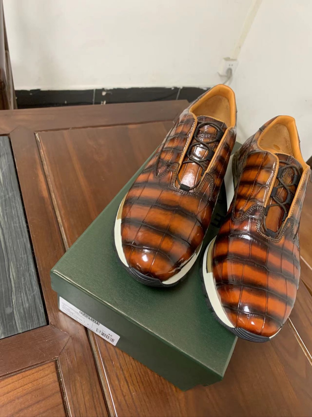 Berluti Fast Track 토리노 악어 가죽 운동화 큰 가죽 스트랩, 펀칭과 장식적인 패턴의 앞코 2개의 눈 스트랩 슈즈, 심플하지만 운동에 도움을 주는 저항선 앞코가 살짝 바깥쪽으로 벌어져 그래픽과 기하학적인 패턴 미끄럼 방지 오목창
