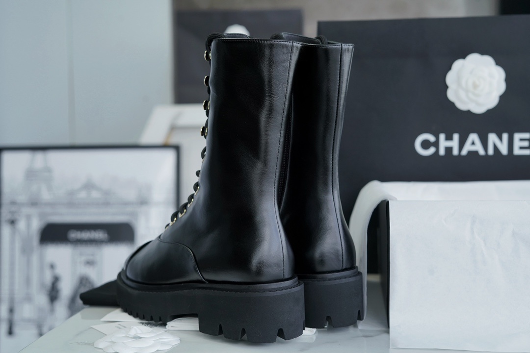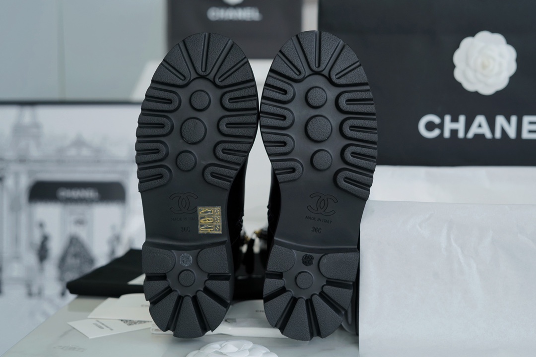 샤넬 23C 블랙 파이핑 워커 SO BLACK 송아지 가죽 패치, 에나멜 머리와 발끝 내마모성 통굽으로 가볍고 신기 좋으며 질기며 스트랩 디자인의 워커 부츠는 종아리 포용성이 높으며 다리라인 비율을 늘려주면서 완벽한 다리라인 보정