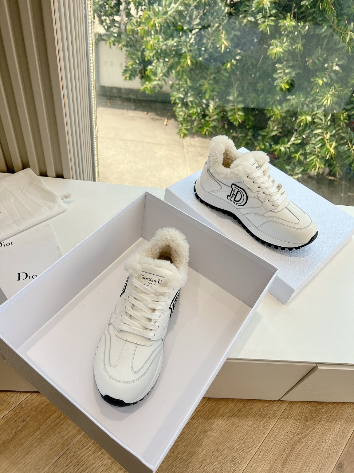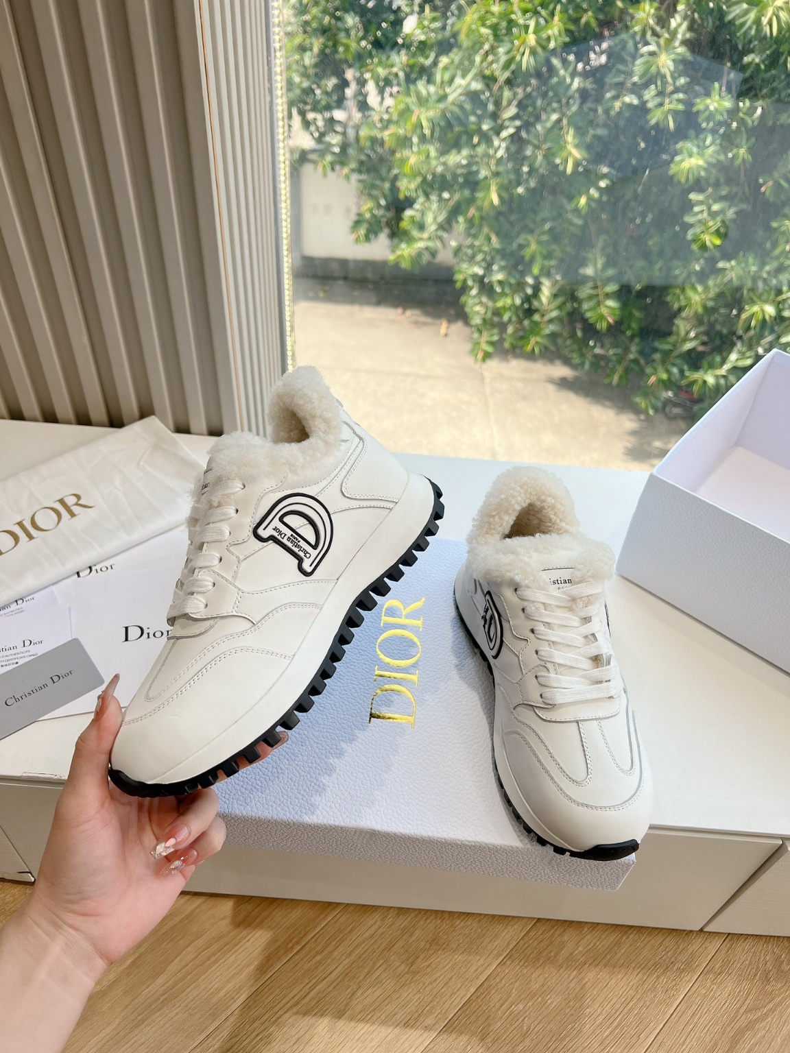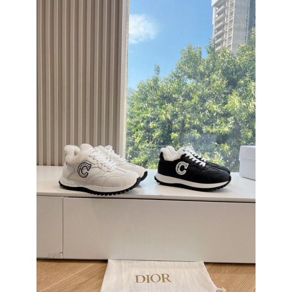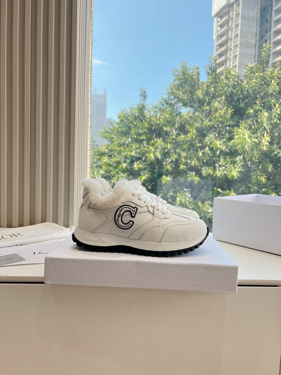 디올 24 가을 신상 새로운 스니커즈 면화 퍼 슈즈는 소가죽과 메쉬 패브릭으로 제작되어 가볍고 통풍이 잘 됨 사이드의 CD 레터링이 디올의 변식도를 주며 스포티한 디자인에 수술 디테일이 어우러져 우아함을 더함 겉감: 오리지널 원단 램스울 안감: 수입 램스울 밑창: 오리지널 플랫폼