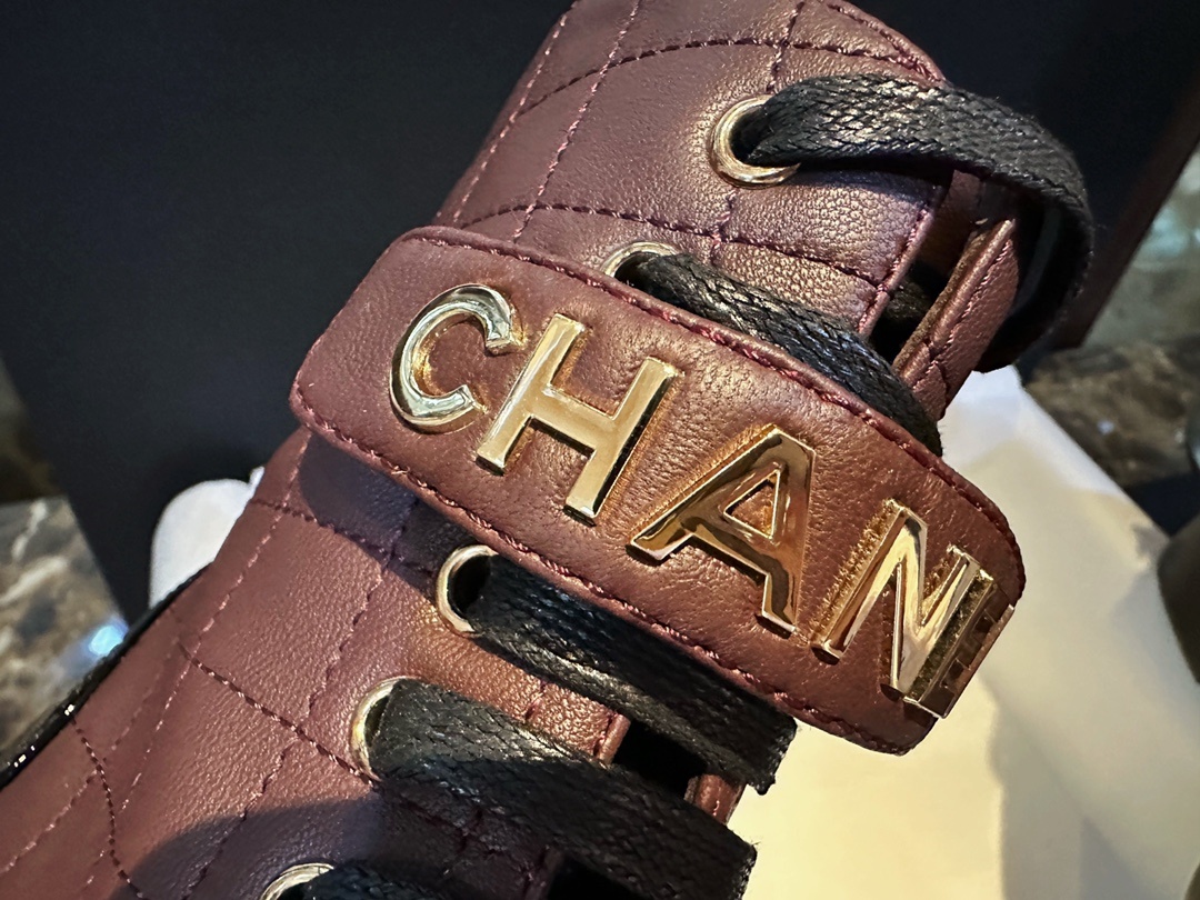 샤넬 23A 와인 양가죽 레터링 바이커부츠 와인색 양가죽에 검정 에나멜 구두 앞코가 빳빳하고 멋스러움 단독 오픈형 레터링 하드웨어 로고 수입 프렌치 양은 매우 부드럽고 통기성이 좋으며 사이드 지퍼로 신고 벗기 편하며 스타일과 편안함 모두 갖춤