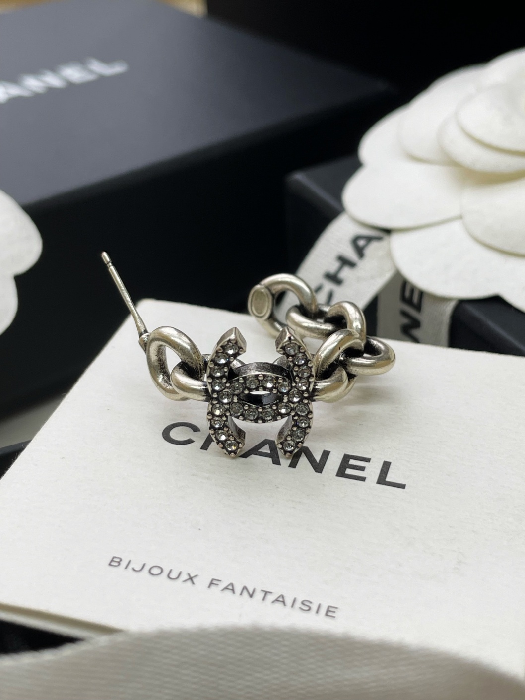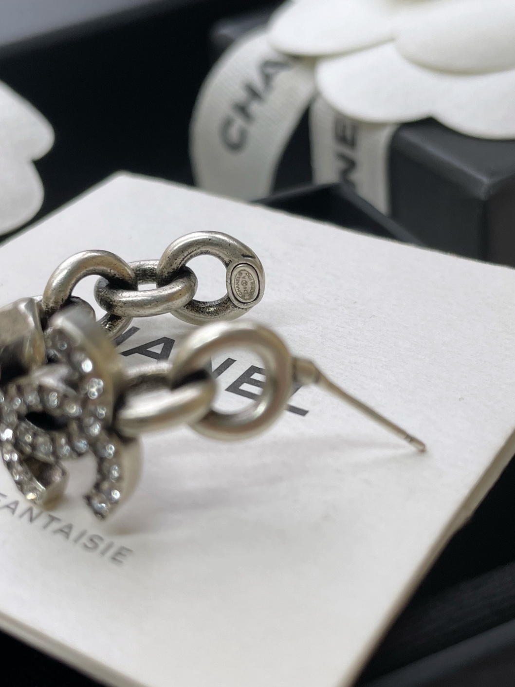 샤넬 건 블랙 체인 큐빅 더블 C 이어링 고급스러운 느낌의 귀걸이 위에 알알이 스와로브스키 크리스털이 펀칭된 체인 링 은은한 귀금속 블랙요도금 질감 디테일이 세련되게 유일하게 ZP를 실제 구매하여 개발 ZP 일치 신주 소재, 수입 스와로브스키 큐빅 귀걸이 높이 약 3CM 더블C 폭 약 1.5CM
