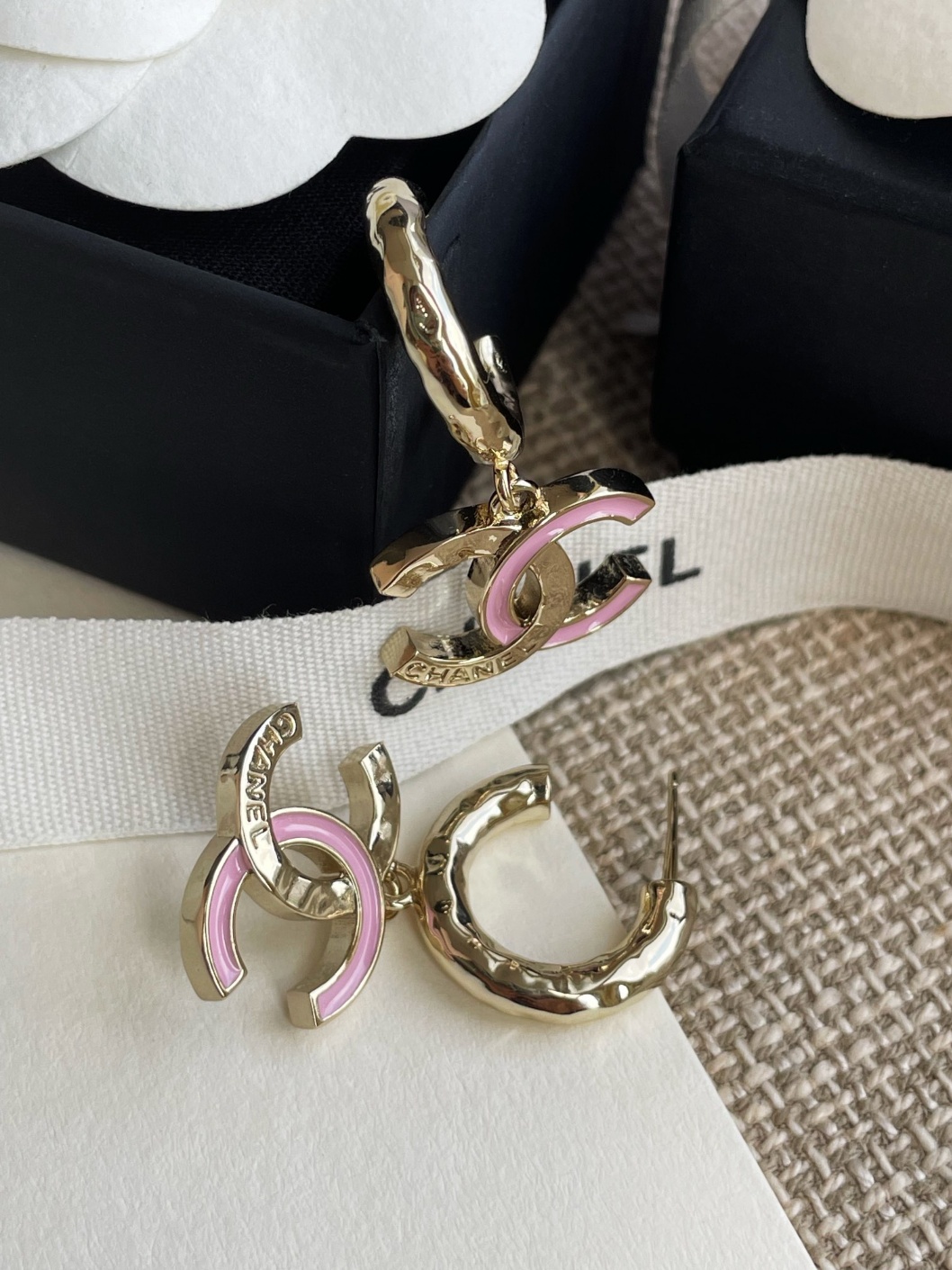 샤넬 골드 후크 더블 C 이어링 24 초가을 신상 절미 컬렉션 매회 반드시 들어가는 클래식 더블c 이어링 핑크빛 연한 법랑의 메탈에 알파벳 로고, 정교함 그대로 심플하면서도 스타일리쉬한 스타일링 유일하게 ZP를 실제 구매하여 개발 ZP 일치 신주 소재 귀걸이 높이 약 3.8CM 폭 약 2CM