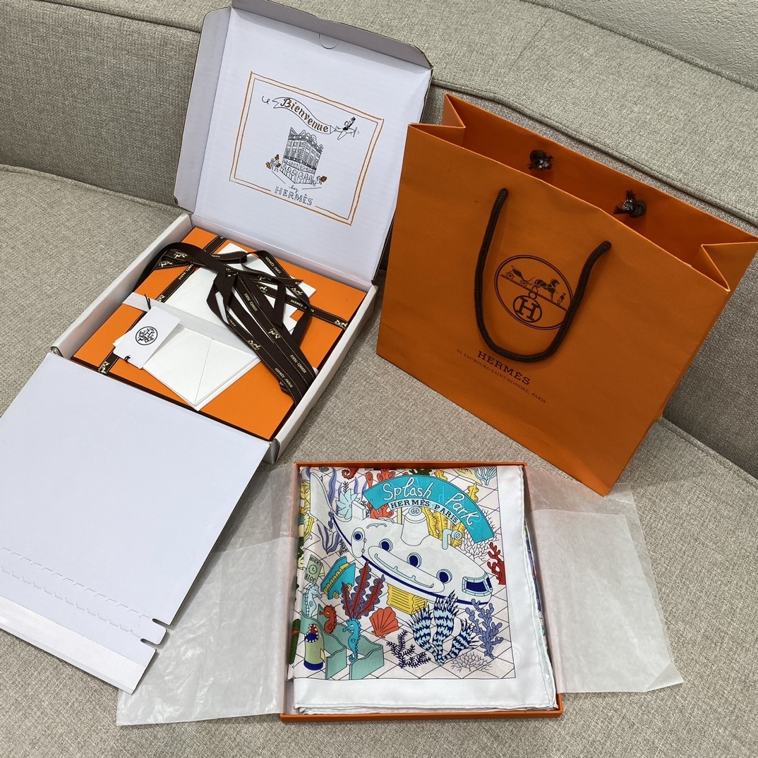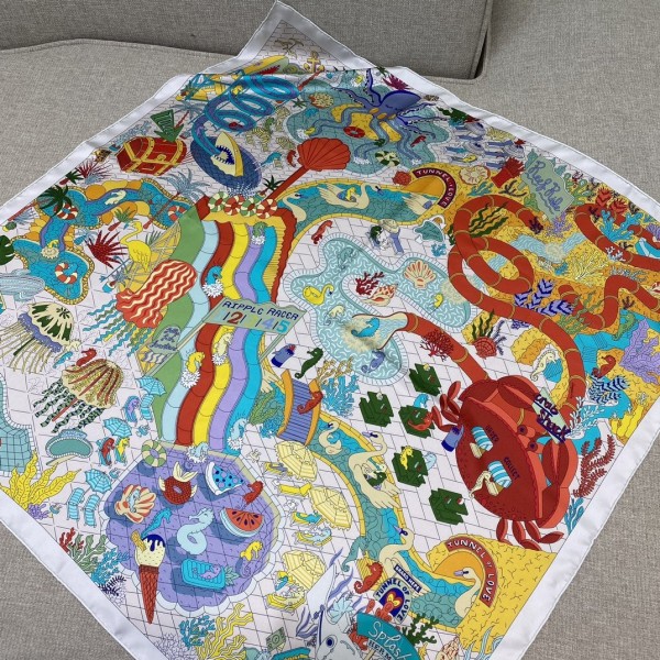 에르메스 물놀이공원 양면타월 연원: 환상의 워터파크는 즐거움과 재미로 가득했던 어린 시절 대담무쌍한 해마는 거대한 미끄럼틀에서 미끄러져 내려와 탐욕스러운 상어에게 곧장 돌진 어떤 해마는 백조 보트를 타는 것을 좋아하고 다른 해마는 분수와 문어 파라솔로 둘러싸인 태양 아래서 아이스크림을 즐김 영국 일러스트레이터 재클린 콜리는 에르메스가 2019년 개최한 국제 스카프 디자인 콘테스트에 참가해 유머러스한 디자인으로 11명의 결선 후보를 제치고 특별상을 수상한 바 있음 이 스카프를 통해 그녀는 우리를 천마가 하늘을 나는 환상적인 세계로 안내함 소재: 100% 실크 size: 90x90cm