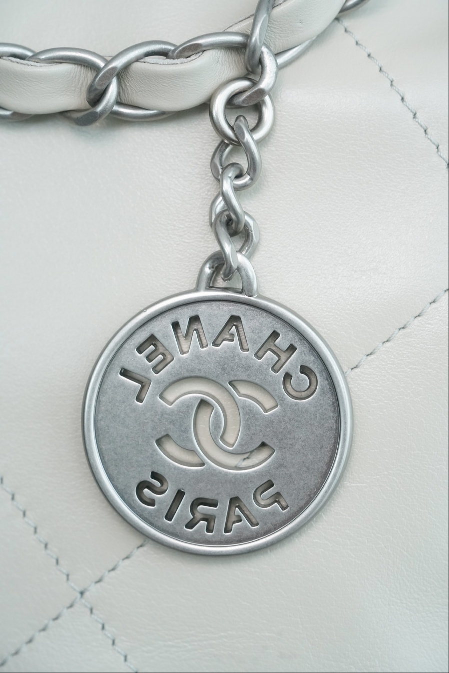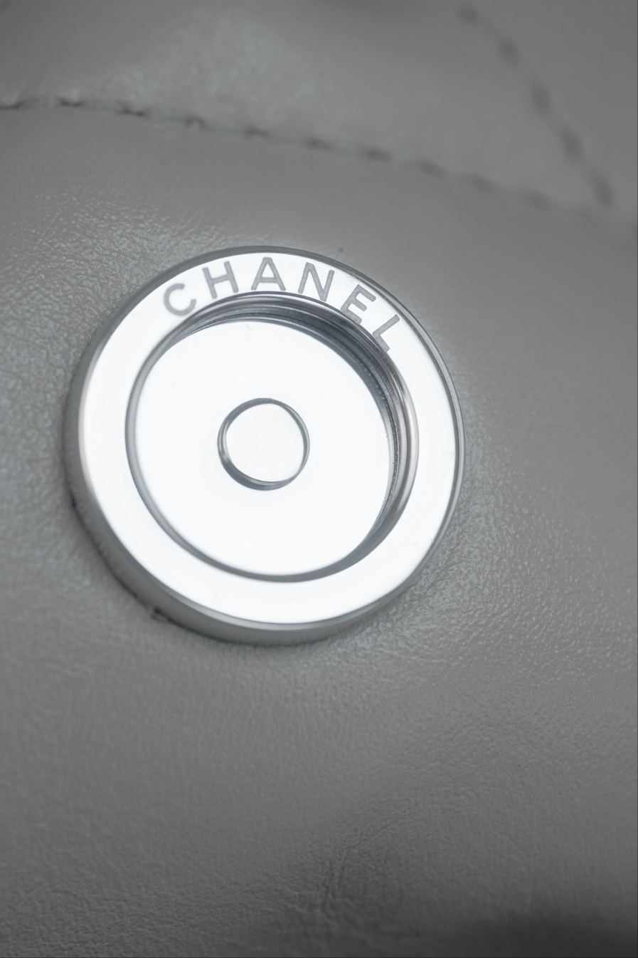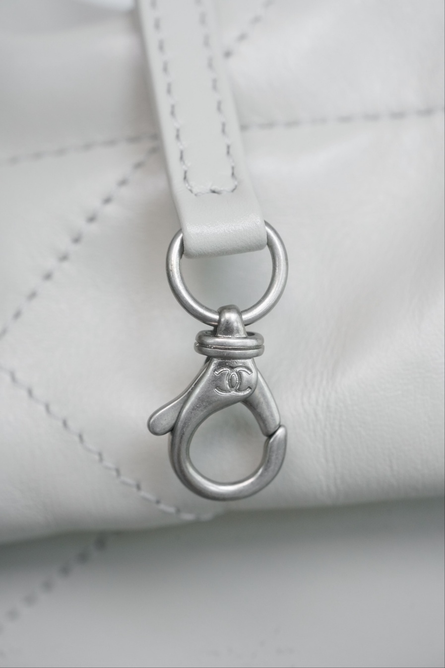 샤넬 22 클러치 정품가죽 스몰 라이트그레이 실버버클 모델번호 AP3260 이태리 몬테벨로 1급 오리지널 후피 사용 가죽이 섬세하고 광택이 나며 부드러우면서도 마모에 강하여 두 마리 토끼를 모두 잡았음 심플한 외관에 디자이너들의 고급스러운 디자인 펀칭된 샤넬로고의 금화, 작은 포인트로 전체적인 분위기를 업 빈티지한 감성을 가득 담아 느슨한 나른함 사이즈 : 35×37×7cm