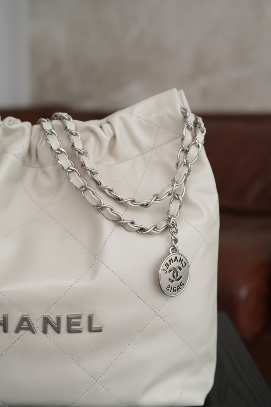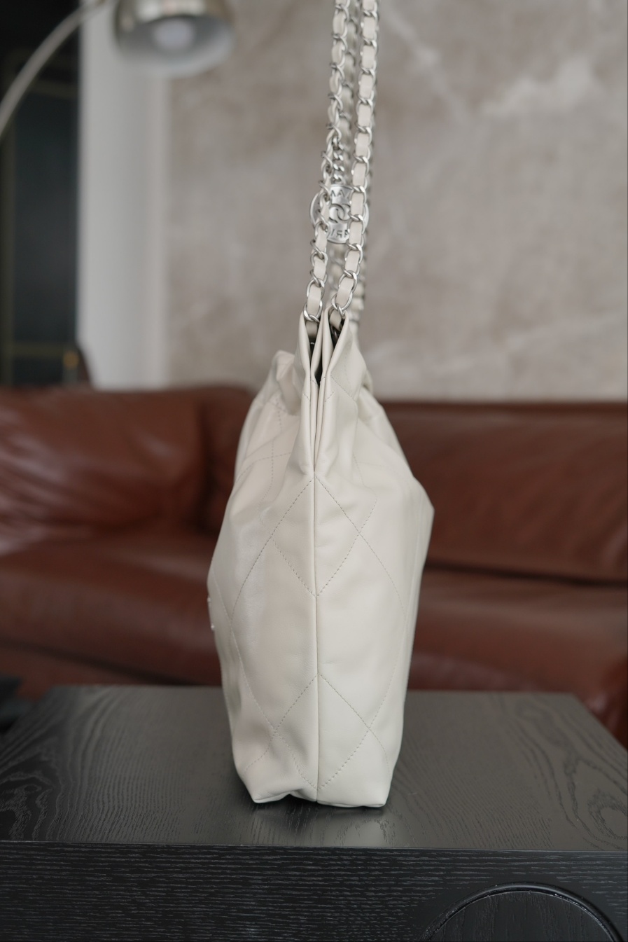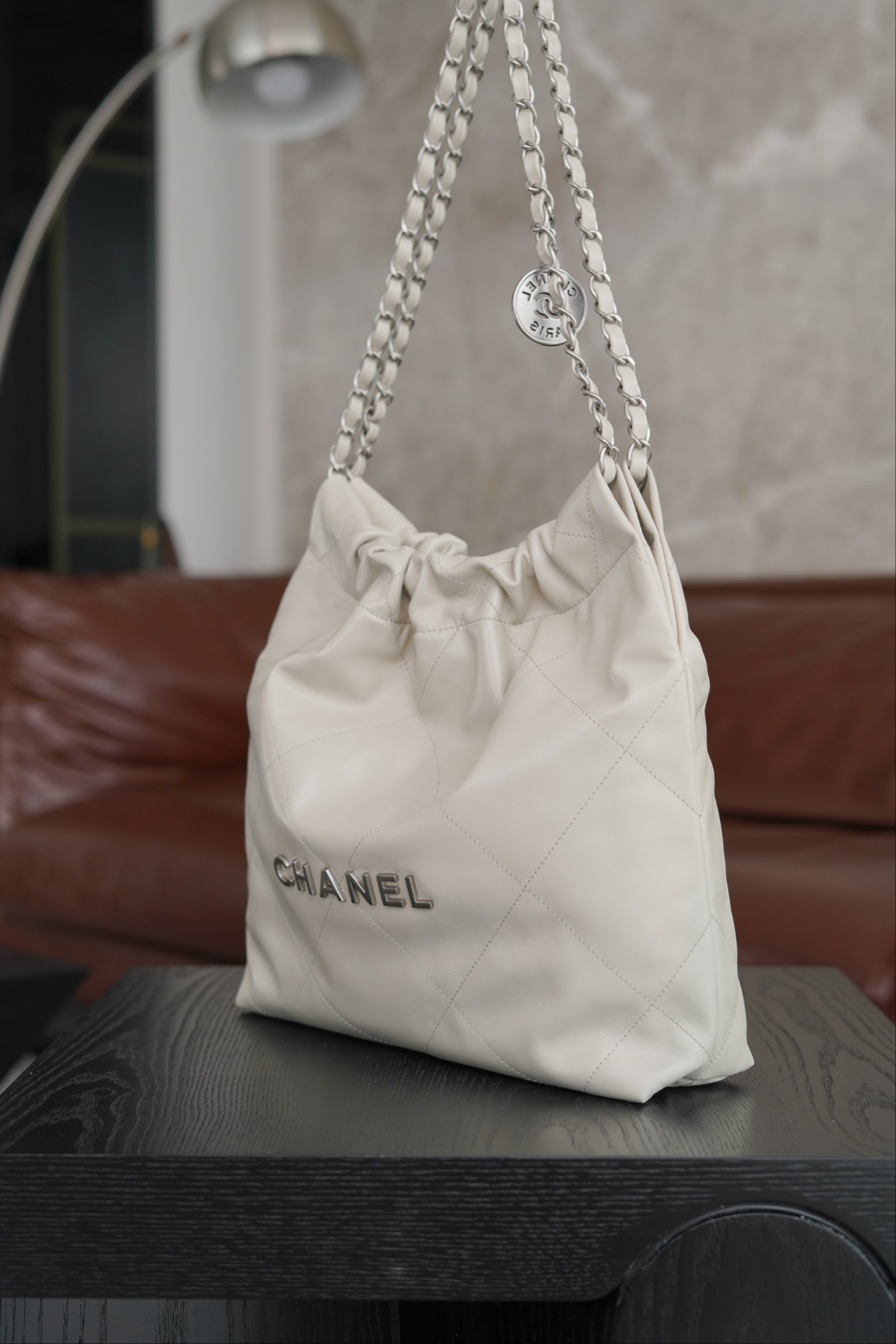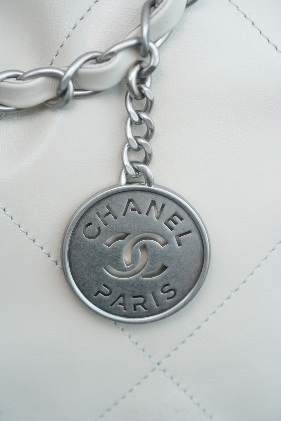 샤넬 22 클러치 정품가죽 스몰 라이트그레이 실버버클 모델번호 AP3260 이태리 몬테벨로 1급 오리지널 후피 사용 가죽이 섬세하고 광택이 나며 부드러우면서도 마모에 강하여 두 마리 토끼를 모두 잡았음 심플한 외관에 디자이너들의 고급스러운 디자인 펀칭된 샤넬로고의 금화, 작은 포인트로 전체적인 분위기를 업 빈티지한 감성을 가득 담아 느슨한 나른함 사이즈 : 35×37×7cm