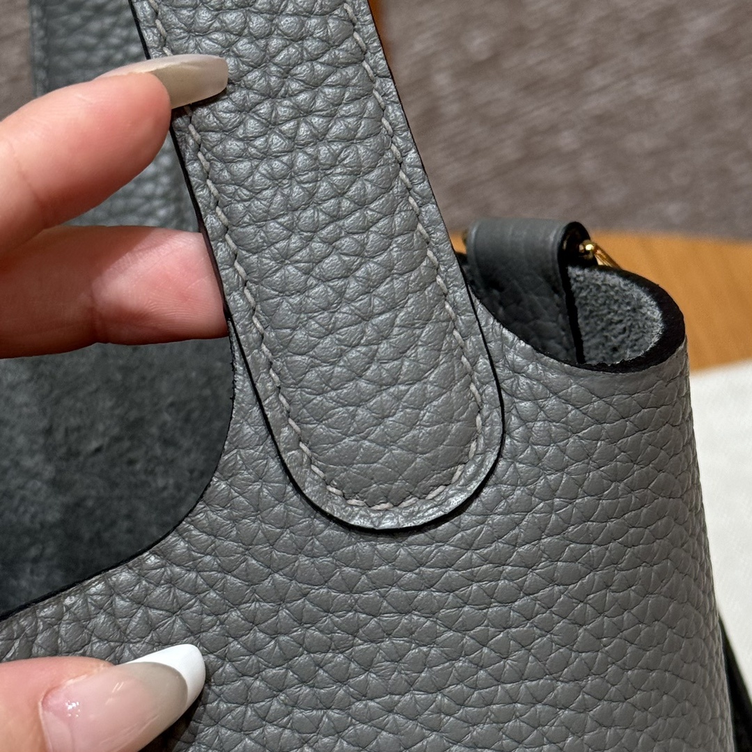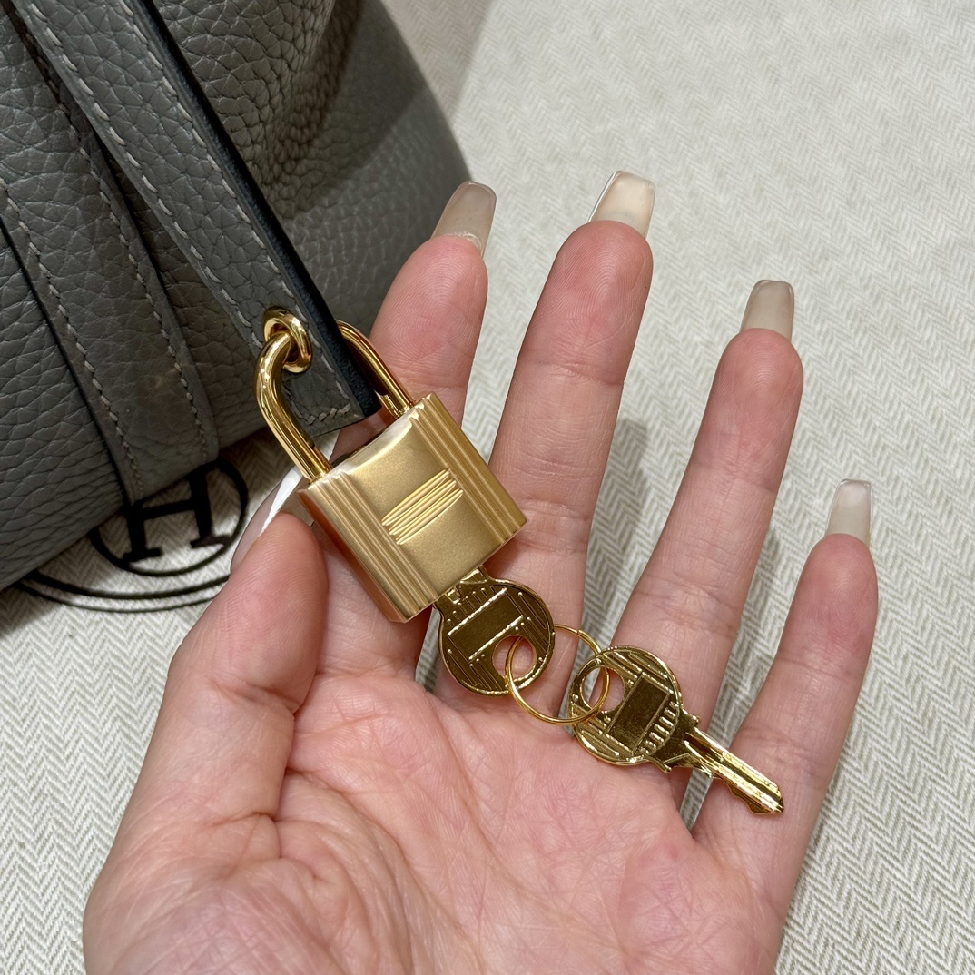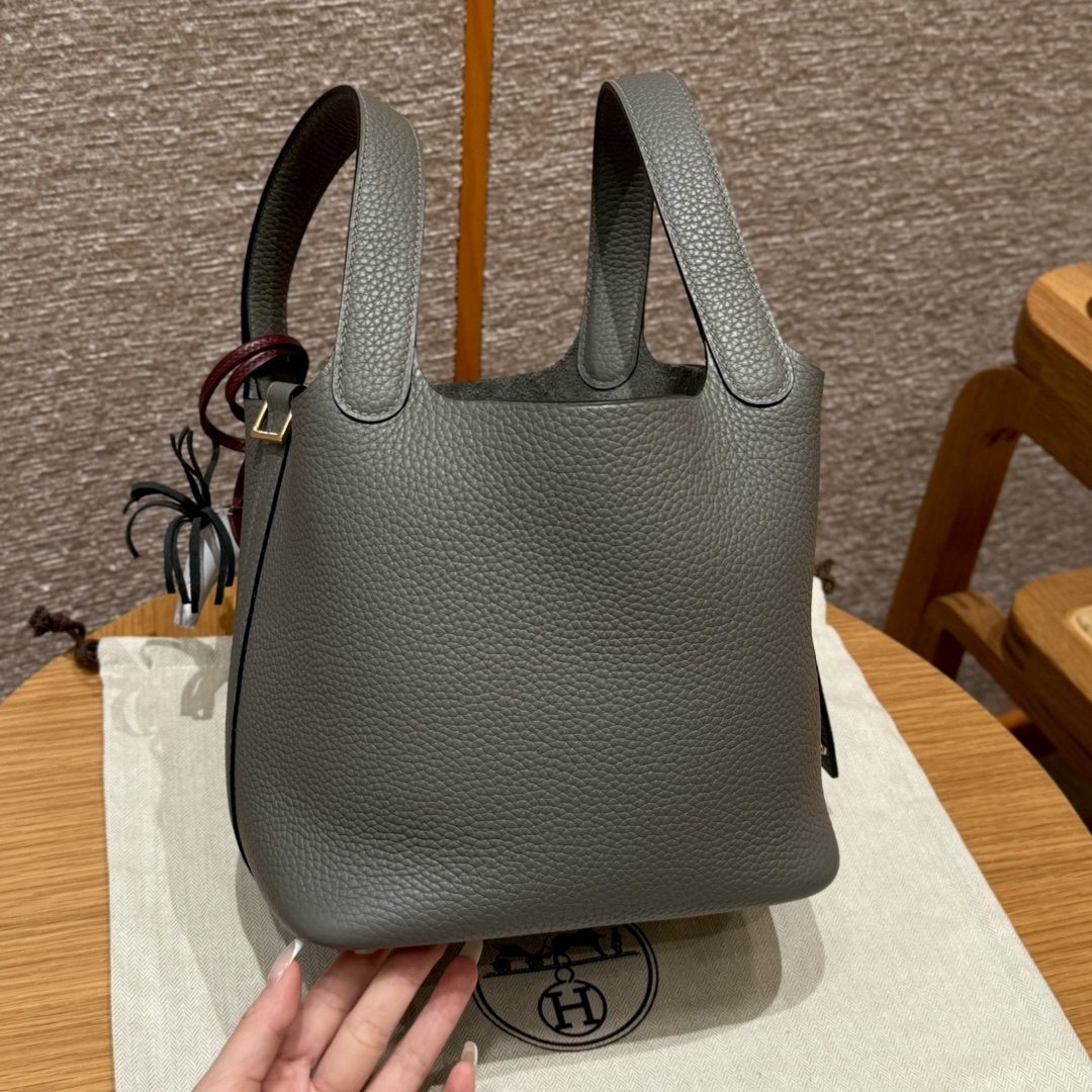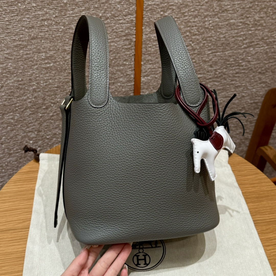 Style:Picotin lock Colour:OL/Gris Meyer Size:18*13*18cm Leather:clemence Hardware:gold 피코탄 18cm 그리스메이어, 프랑스 수입 소가죽 골드단추, 고급 풀핸드메이드 맞춤 주문 실사