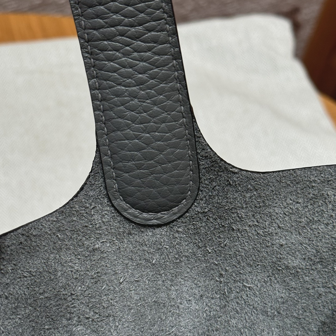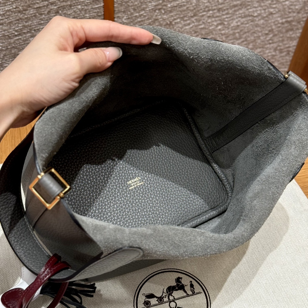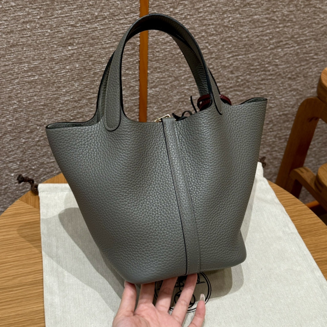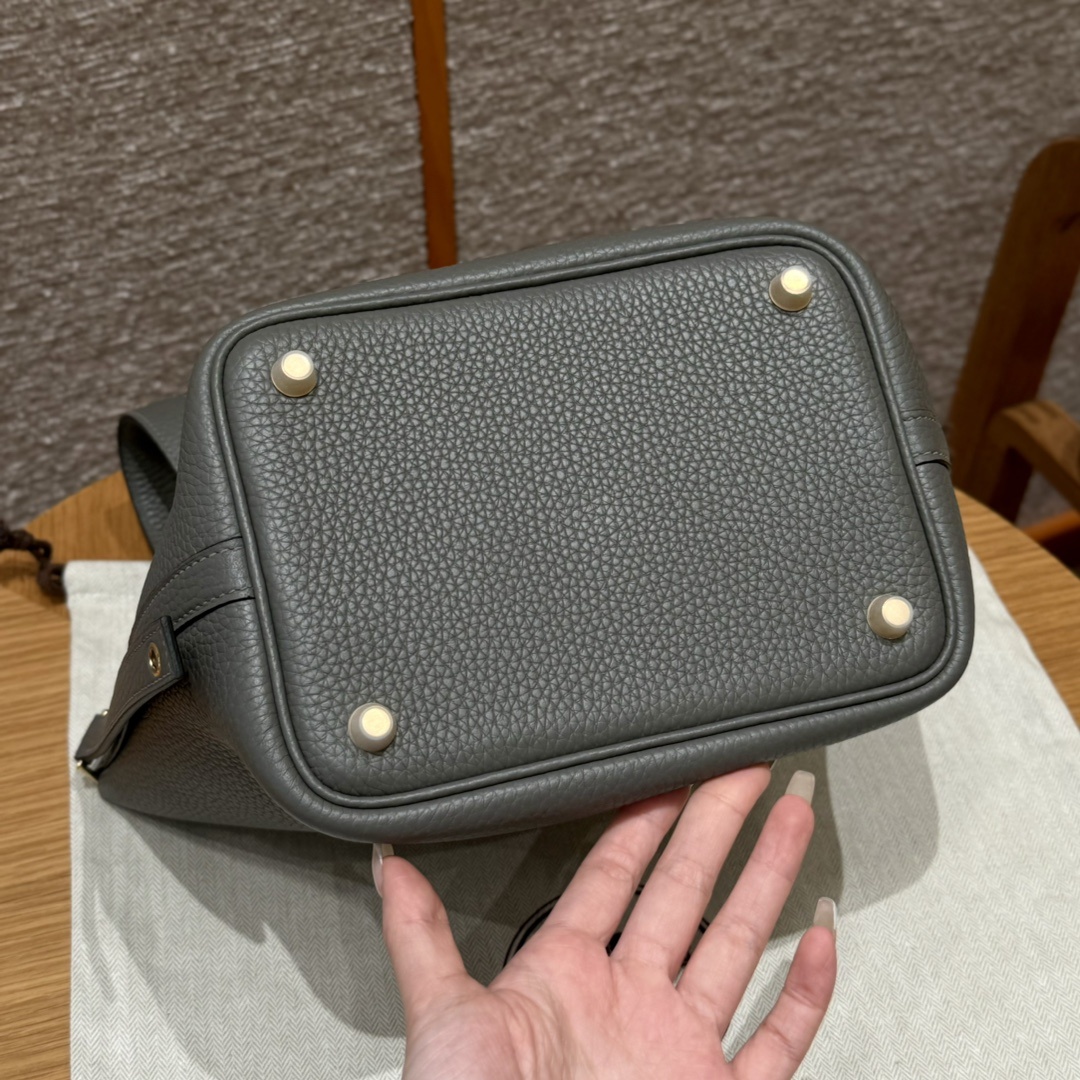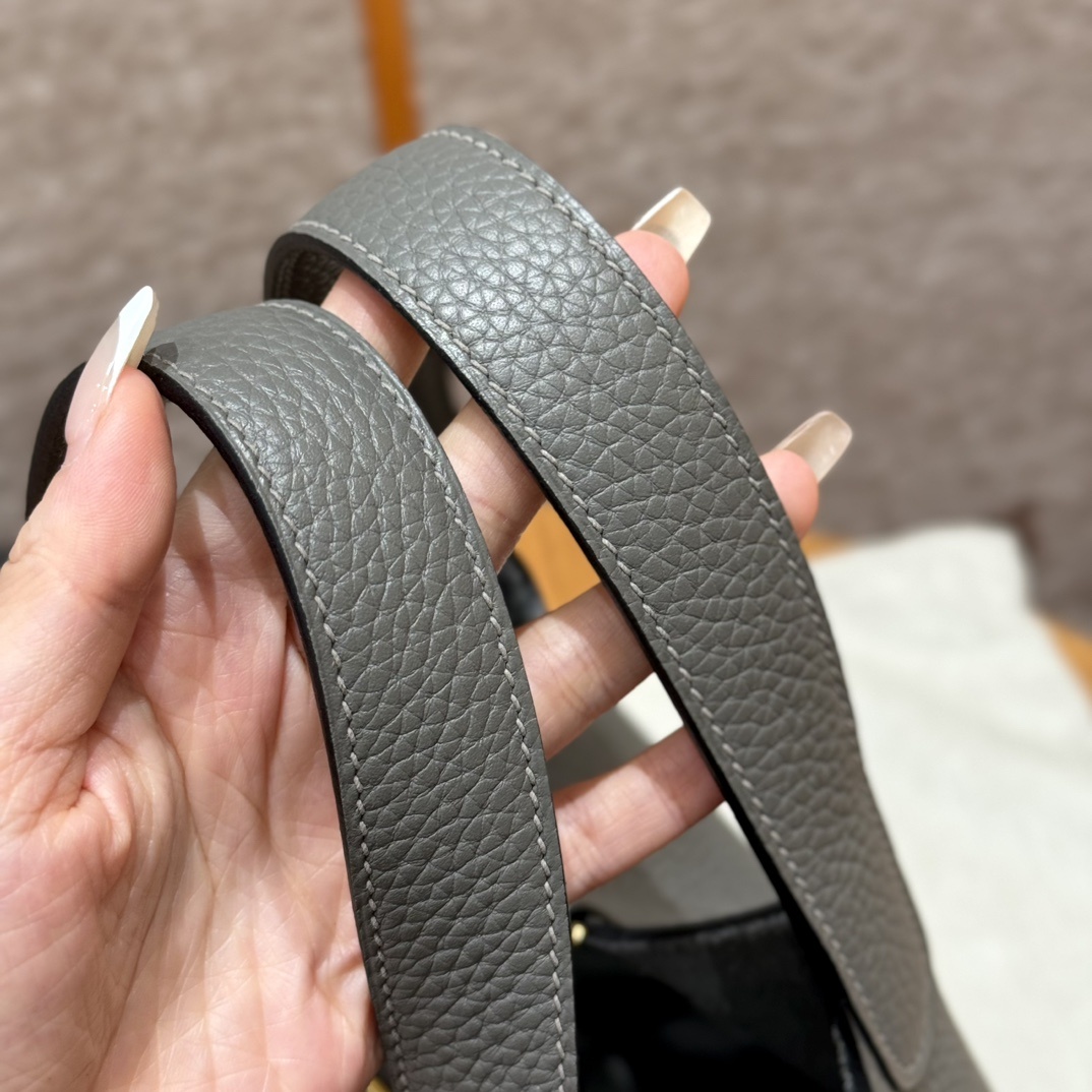 Style:Picotin lock Colour:OL/Gris Meyer Size:18*13*18cm Leather:clemence Hardware:gold 피코탄 18cm 그리스메이어, 프랑스 수입 소가죽 골드단추, 고급 풀핸드메이드 맞춤 주문 실사