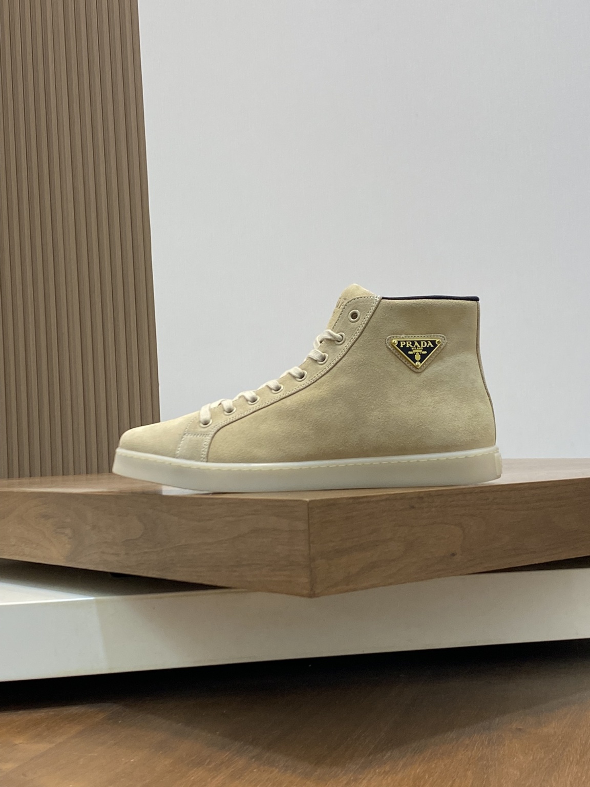 프라다 남성 신상 캐주얼 하이탑 스니커즈 이 신발의 표면은 수입 송아지 가죽과 전용 망사 천으로 제작 바깥쪽은 P가죽 클래식한 메탈 삼각 법랑 로고 안감 망사 천, 깔창 소가죽, 바닥은 미끄럼 방지 바닥은 발 감촉이 좋고 모던하며, 표준 스포츠 핏