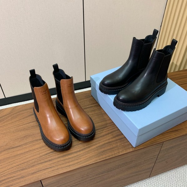 프라다 가을겨울 클래식 첼시 앵클부츠 소가죽 앞코에 밴딩 소재와 질감, 디테일로 꽉 차 있음 밑창 두께감이 어느 정도 있어 키높이 효과 겉감 오리지널 에나멜 소가죽 안감/발받침 원판 내마모성 고무 밑창