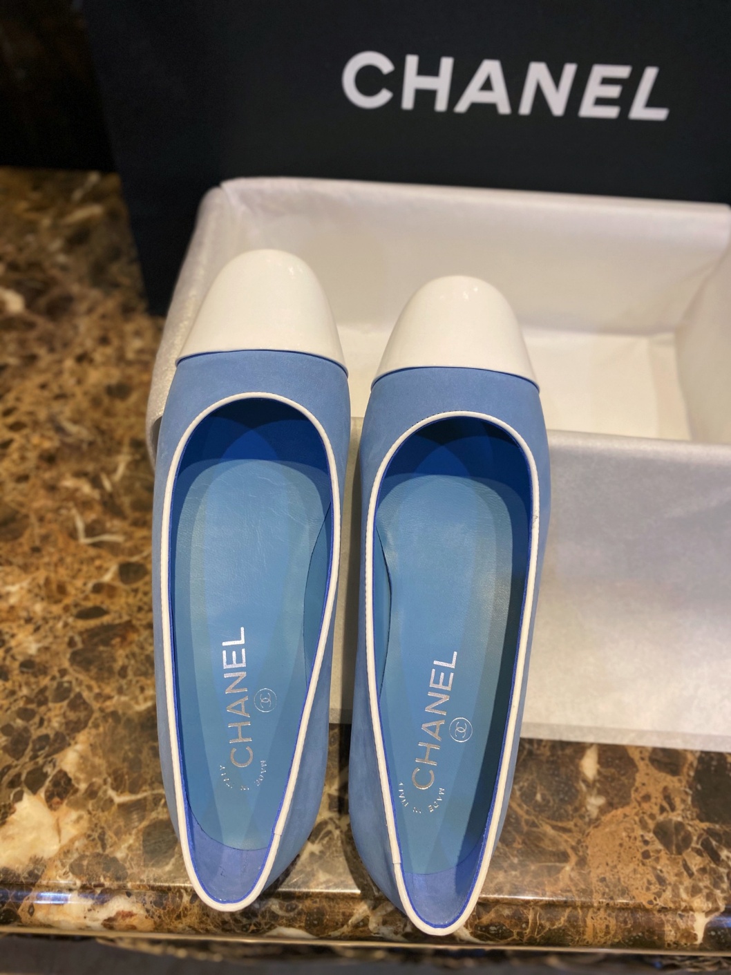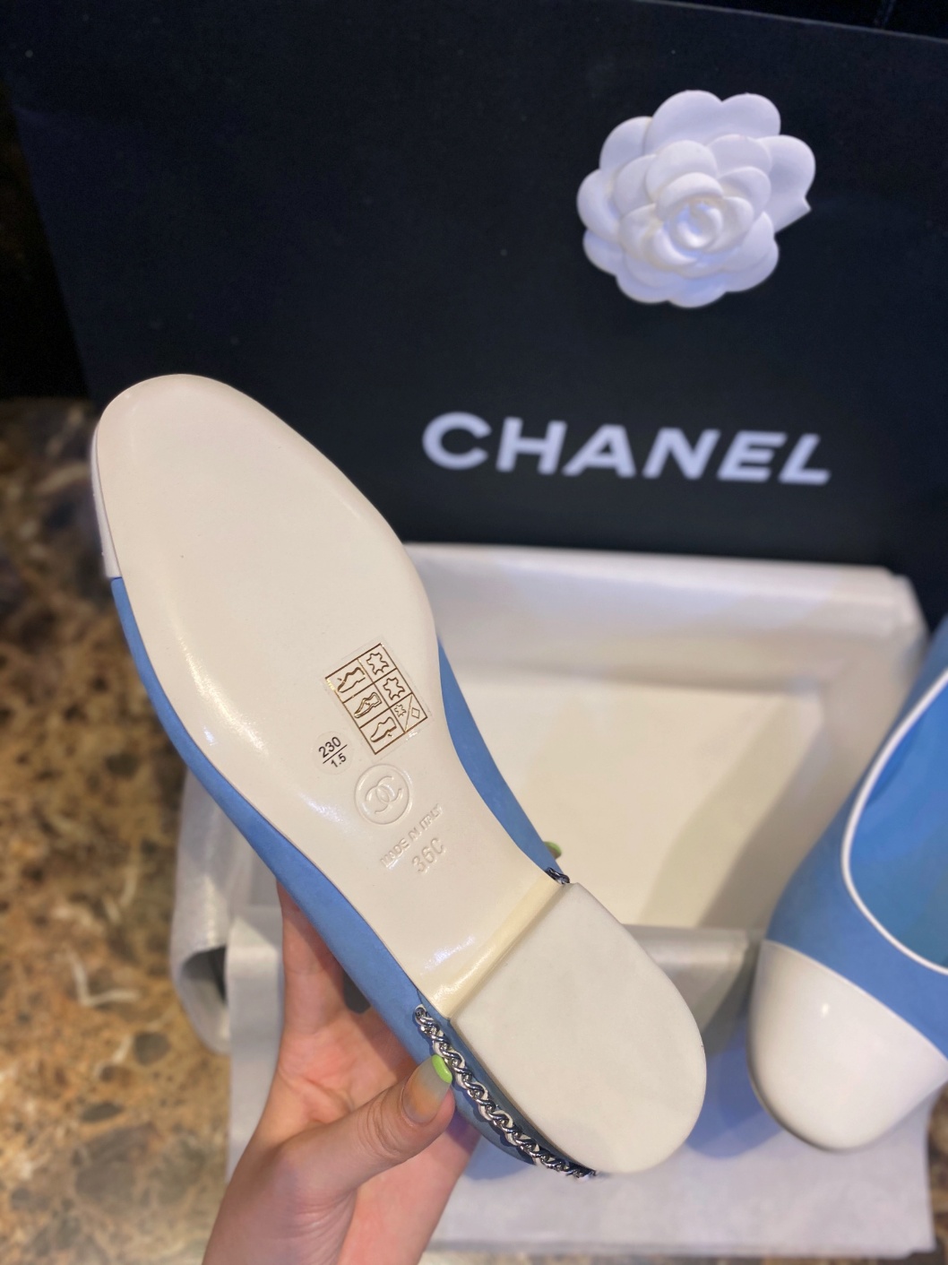 샤넬 화이트 패치 블루 체인 플랫슈즈 뒷축 체인이 포인트 심플함에 숨어있는 세련미