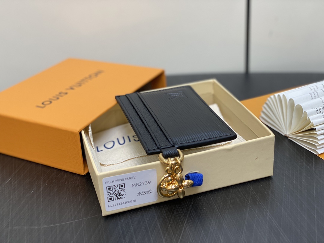 블랙 물결무늬 참 카드지갑 컬렉션 LV Charms 명함지갑은 모노그램 코팅 캔버스 및 소가죽으로 제작되어 선물용으로 좋은 아이템 명함지갑은 2개의 골드 모노그램 블러썸 참 장식으로 구성 5개의 명함지갑을 갖추고 있으며 그 중 2개는 양옆에 더 큰 칸막이를 가지고 있음 사이즈 10.2 x 7.3 x 0.3 cm