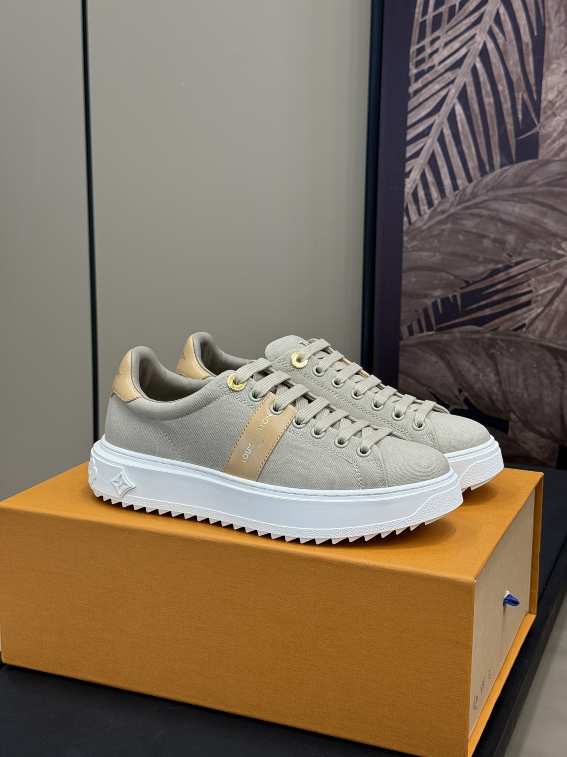 Louis vuitton fw24 new arrival LV 클래식 키높이 타임아웃 운동화 2024 뉴 에디션 캔버스 표면을 수입한 제품으로 측면 하트 로고가 눈부시게 돋보임 음각 펀칭과 뒷부분 메탈릭한 가죽 트리밍의 풍부한 디테일로 도톰한 고무 밑창이 모노그램 꽃을 피웠음