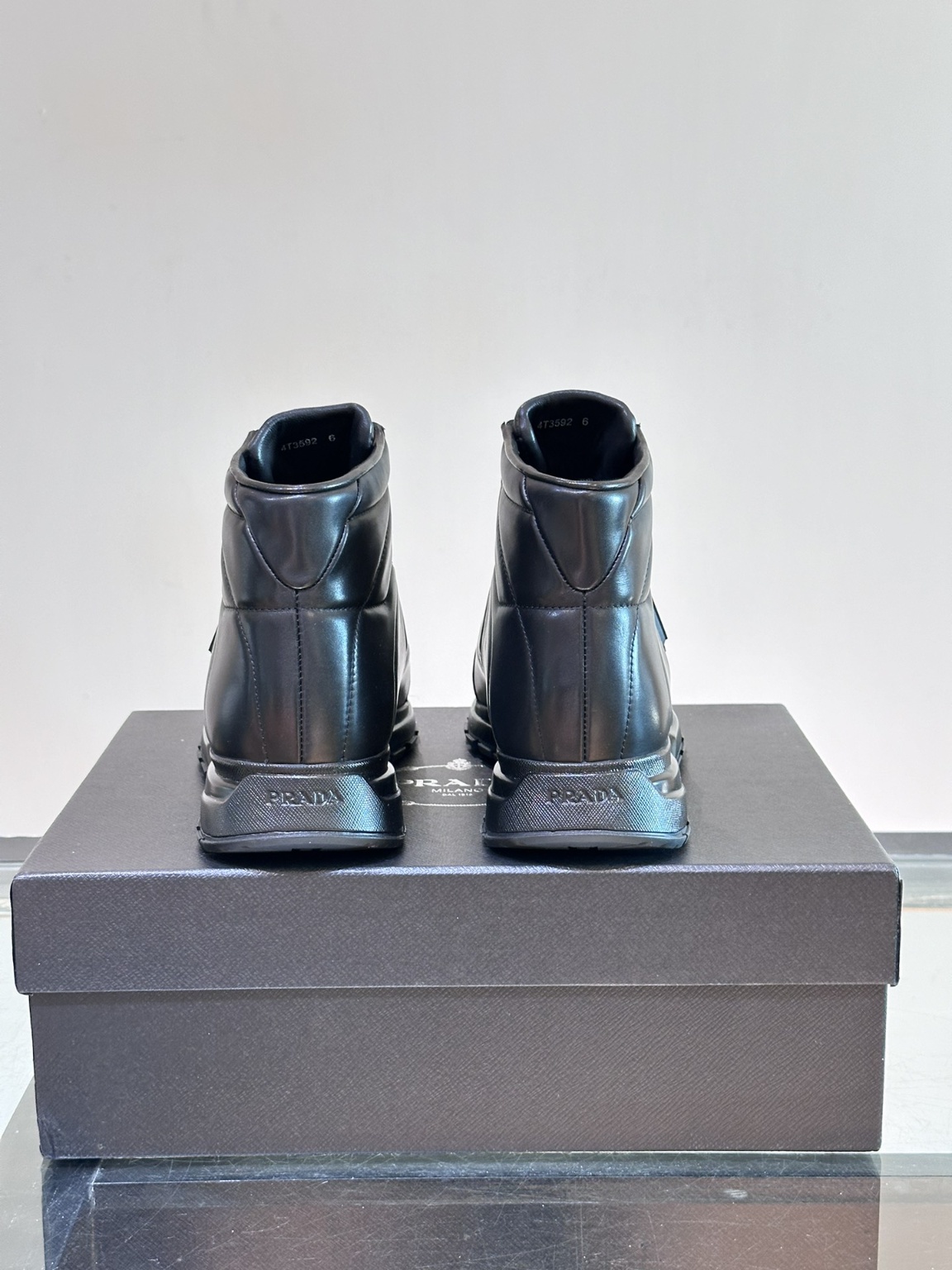 프라다 2024 신상품 남성 하이탑 운동화 수입 송아지 가죽 소재가 부드럽고 편안하며 속가죽에 송아지 깔창, 신발의 옆면 클래식 삼각 로고 장식 오리지널 고무창, 미끄럼 방지, 마모 방지, 편안함