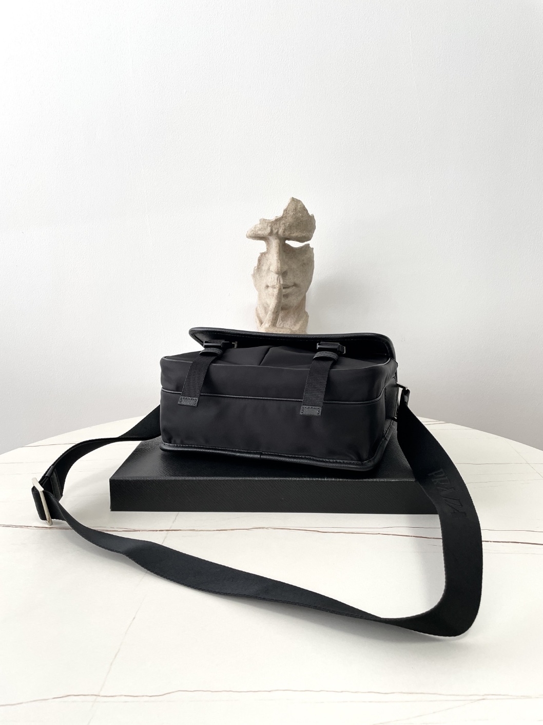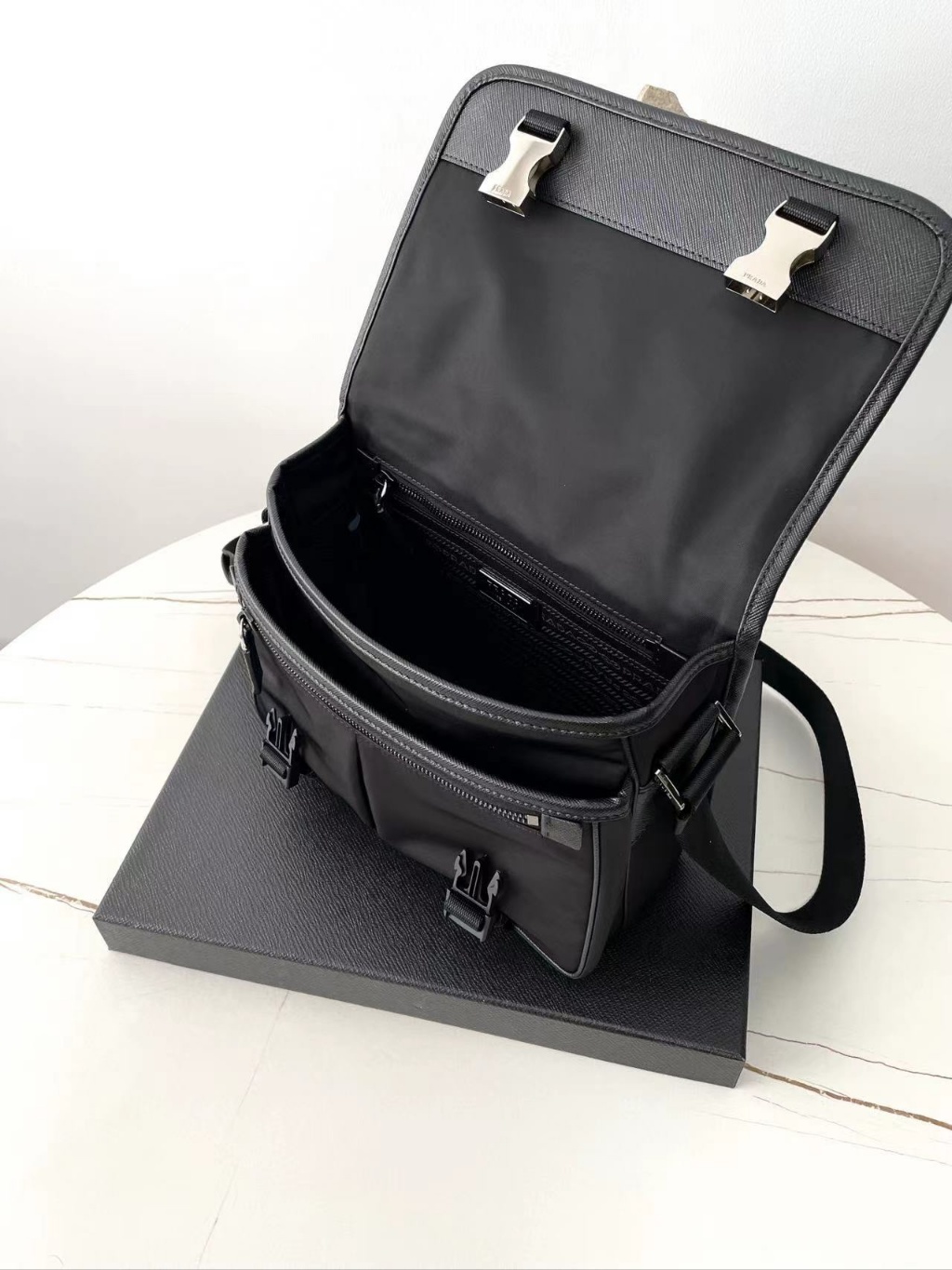 프라다 리나이론 사피아노 크로스백 바디 전체에 가장 클래식한 나일론 소재에 패브릭 와이드 스트랩을 매치하여 심플하면서도 가볍고 스타일리쉬한 느낌의 크로스백으로 블랙 컬러의 가방 앞에 클래식한 실버 프랑 삼각 로고 포인트 플랩 여닫이 디자인으로 가방 속 소품의 안전성은 물론 전체적인 볼륨감과 실용성을 더해줌 모델번호: 2VD769 사이즈: 26×19×10cm