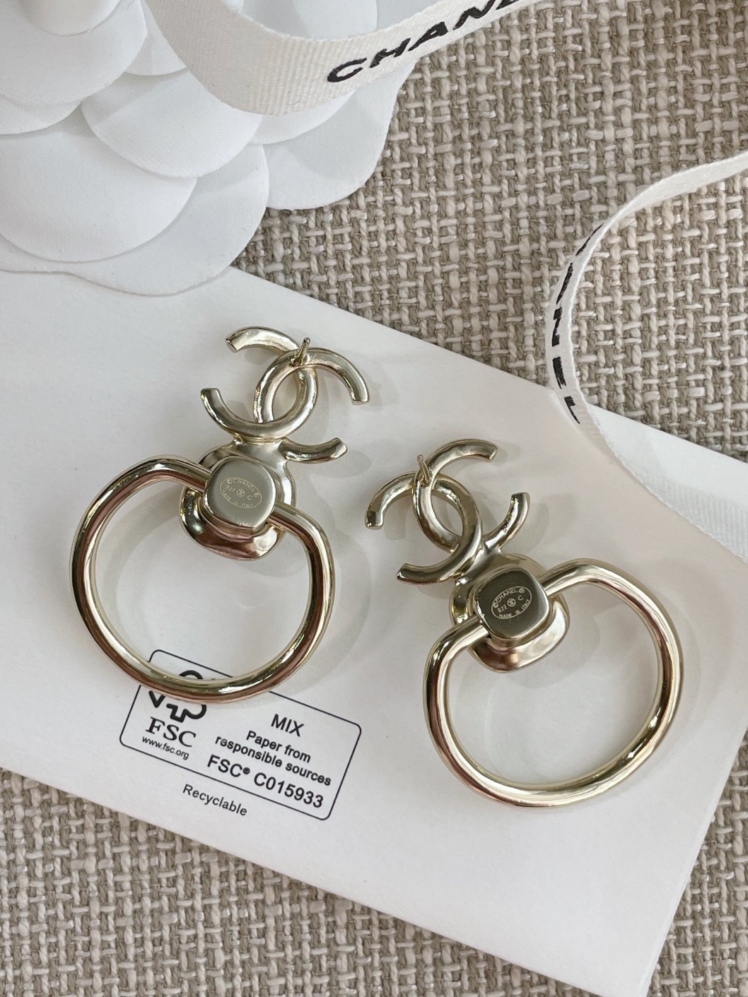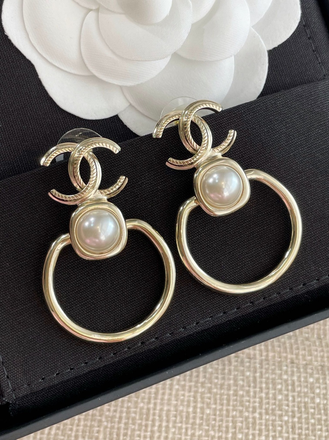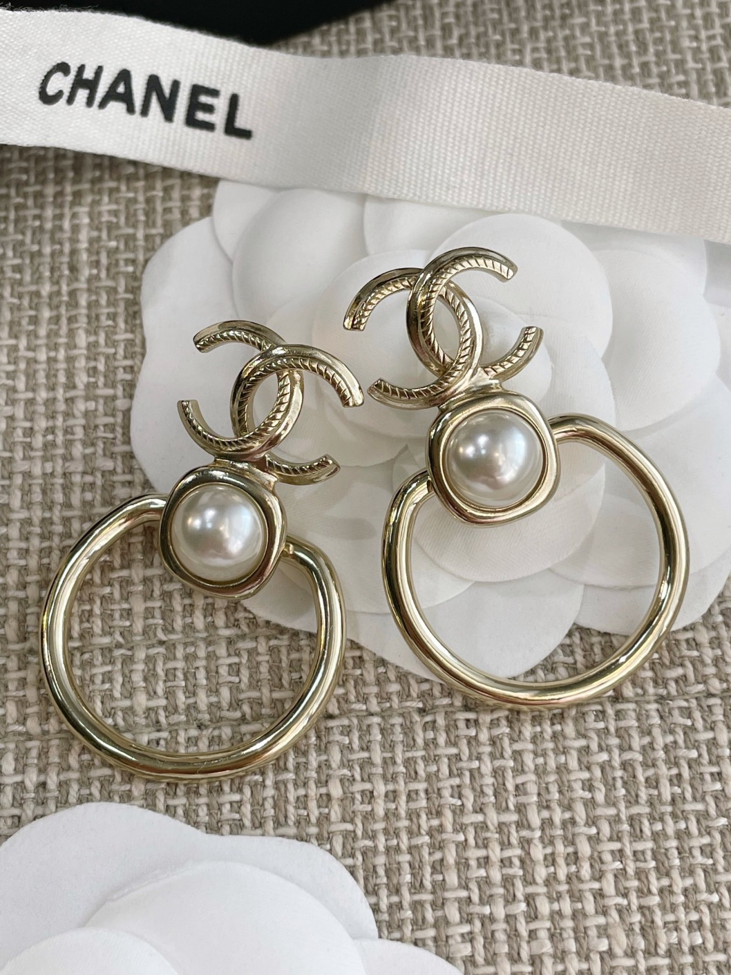 샤넬 더블 C 후프 귀걸이 너무 예쁘서 정말 깜짝 놀랄만한 아이템 심플한 라인 디자인으로 모던한 미스 룩을 연출 빈티지하고 중간중간 특정 빵구슬 포인트가 너무 잘 어울림 유일하게 리얼모델로 ZP 구매 개발 ZP 일치 신주 소재, 수입 스와로브 진주 귀걸이 높이 약 4.7CM, 폭 약 3.1CM