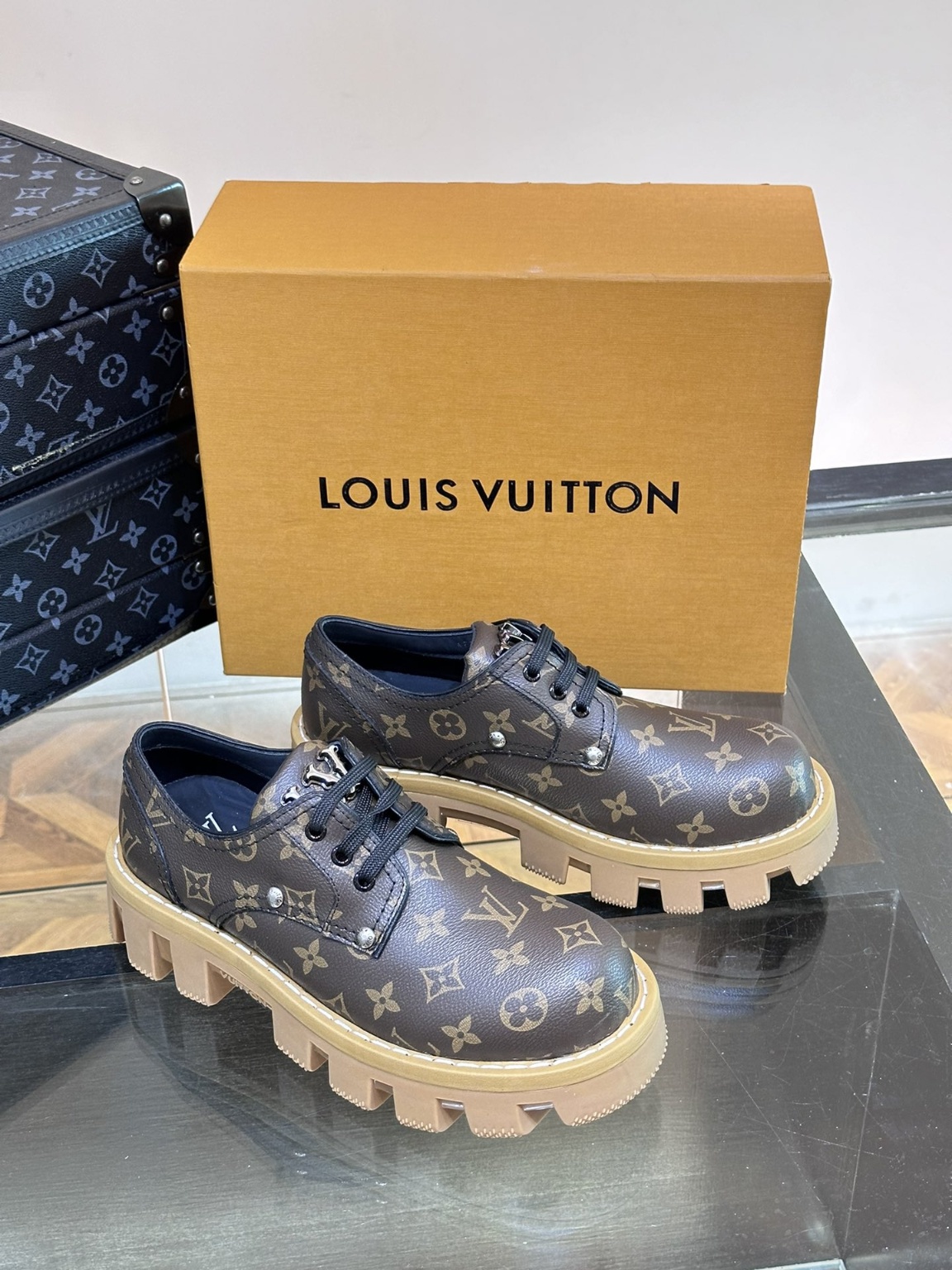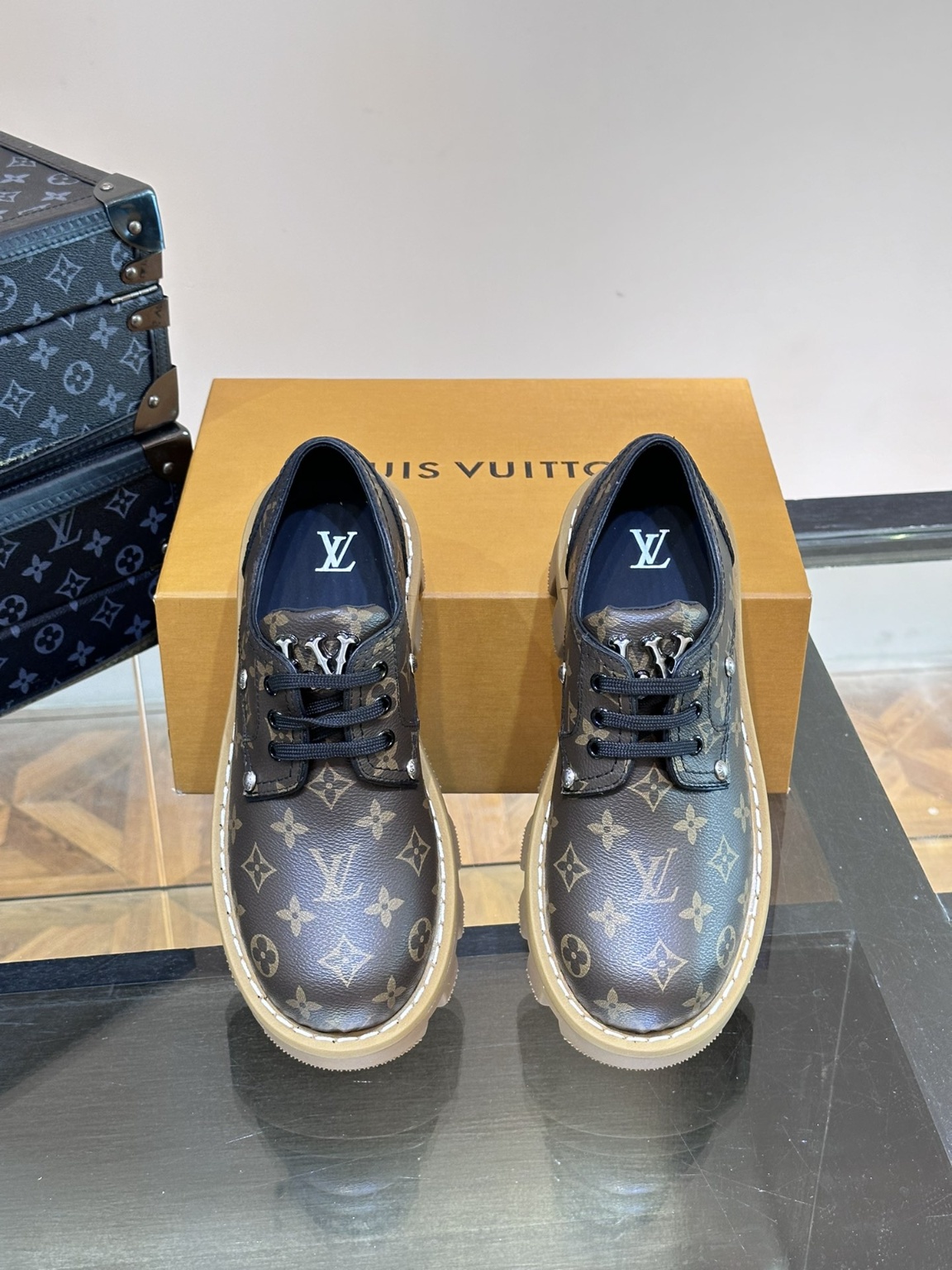 루이비통 2024 남성복 패션쇼에 등장한 체커 라운드 더비슈즈 앞면에 음각 메탈 스터드와 Vuitton 스트랩 장식이 포인트 도톰하고 가벼운 고무창은 카고 슈즈로 디자인 밑창 볼록한 데미어 패턴 포인트