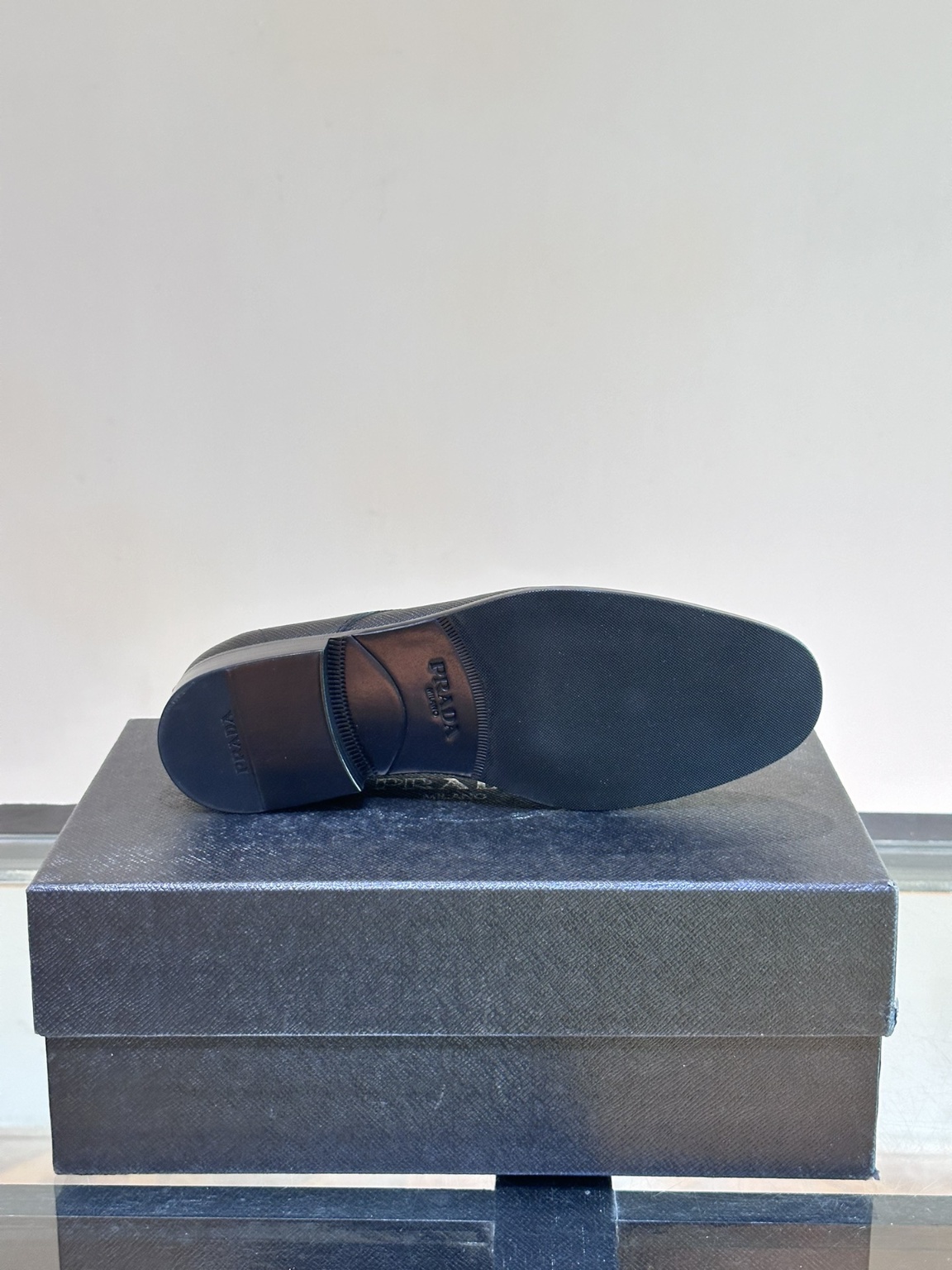 프라다의 클래식한 천연가죽 통굽 정장 캐주얼 구두 수입 소가죽으로 가죽의 결이 곱고 컬러가 밝고 볼륨감이 있으며 스티치 디테일이 세련되어 고급스럽고 우아한 스타일을 자랑함 안감은 본염 송아지 가죽에 소가죽 깔창 로고 디테일로 수입 리얼 가죽 대창과 발끝이 기품있는 스타일