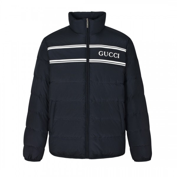 구찌 엠보싱 스트라이프 로고 다운 패딩 100% 고연도의 면섬유와 저연도의 면섬유사를 사용하여 평직조직으로 직조되었음 안감은 면과 스판 섬유를 사용하여 균열을 방지하고 질기고 내구성이 있으며 재료 성능이 안정적 중간층 담포는 T300 고밀도 핀홀 방지 소재로 드릴링 및 다운 덩어리가 떨어지는 것을 효과적으로 방지함 충전 공정은 세그먼트 정밀 분할 충전 방식을 채택하고 각 퀼팅 실의 충전 그램 수를 엄격하게 제어하며 충전은 RDS 인증 고품질 국가 표준 350g 90g 구스다운으로 충전되며 푹신푹신한 환원 효과가 뛰어남 차이나카라 디자인으로 보온성과 실용성이 뛰어나며 어깨까지 오는 디자인에 넉넉한 소매가 어우러져 있으며 소매 끝은 밴딩으로 방풍 마감되어 있음 앞판 시그니처 엠보싱 스트라이프 및 로고 장식으로 오판 프린트가 아닌 두께감이 있음 프론트 레터링 메탈 버클, 전면 지퍼 포켓 도어 더블 오픈 지퍼 모두 실버 도금 처리 맞춤형 부자재 세트로 가공 디테일이 완벽함