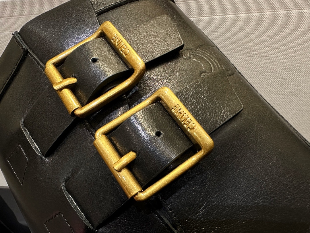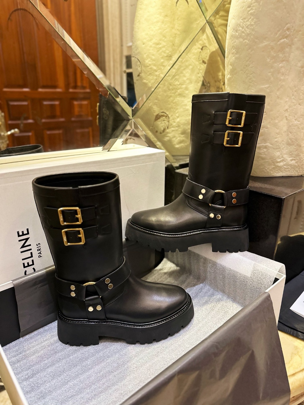 셀린느 미들 라이더부츠 수입 소가죽 앞면+옆면 두 줄 여밈이 있는 스트랩 디자인 5.5cm 두꺼운 바닥 + 가죽 스티치를 따라 펑크 풍을 풍기며 다리 모양에 맞게 조절할 수 있음 심플한 다크톤