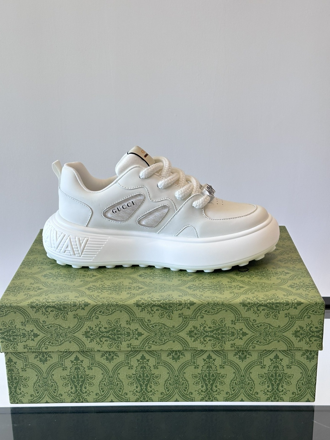 구찌 남성 통굽 스니커즈 매끄러운 송아지 가죽 크래쉬 컬러 배색 앞코 펀칭 디테일, 혀 장식 브랜드 로고 디테일 가벼운 발포 및 큰 바닥, 매우 편안하고 통기성이 있으며 오래 신어도 발이 지치지 않고, 패션 활력이 넘침