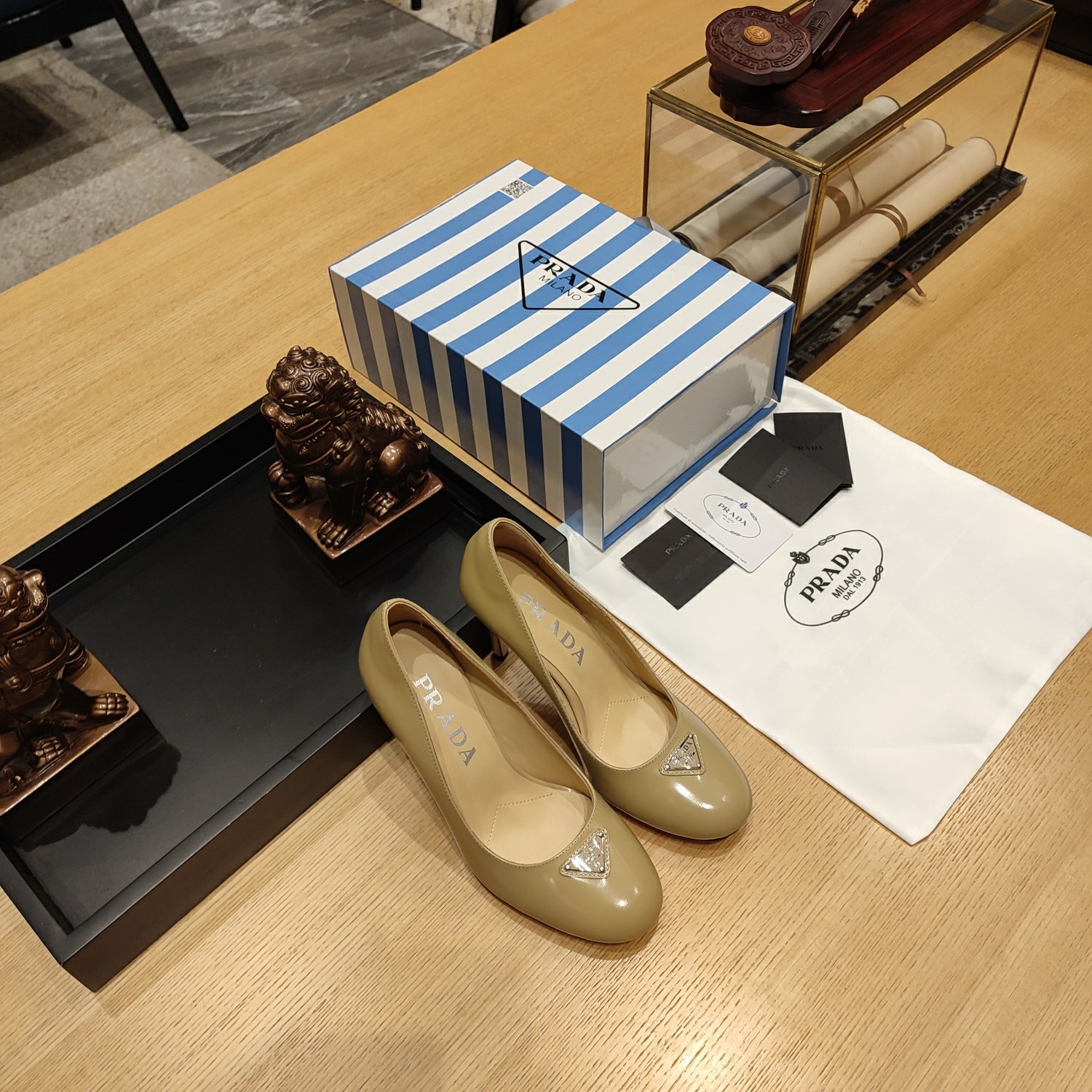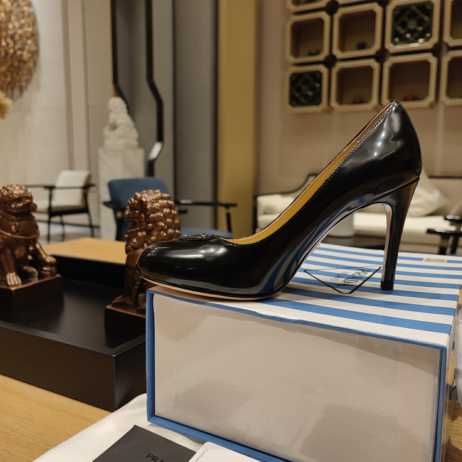 프라다 2024 최신 하이힐 라운드 토 슈즈 톱 패키지 최고 버전, 브랜드에서 보기 드문 둥근 커프스 비딩 오리지널 프리미엄 트임 비딩 소가죽 간단해 보이지만 제작이 까다롭고 오리지널 앞코 모양 골격+클래식한 프라다 로고 메탈릭 버클이 고급품인지 아닌지는 세세한 부분까지 비교해 보면 알 수 있음 굽 9.5cm 단독 24년 블루 스트라이프 매장 멤버십 한정 자석 케이스 포장 트임펄 소가죽 원단+양가죽 안감+이태리 3A급 소가죽 바닥