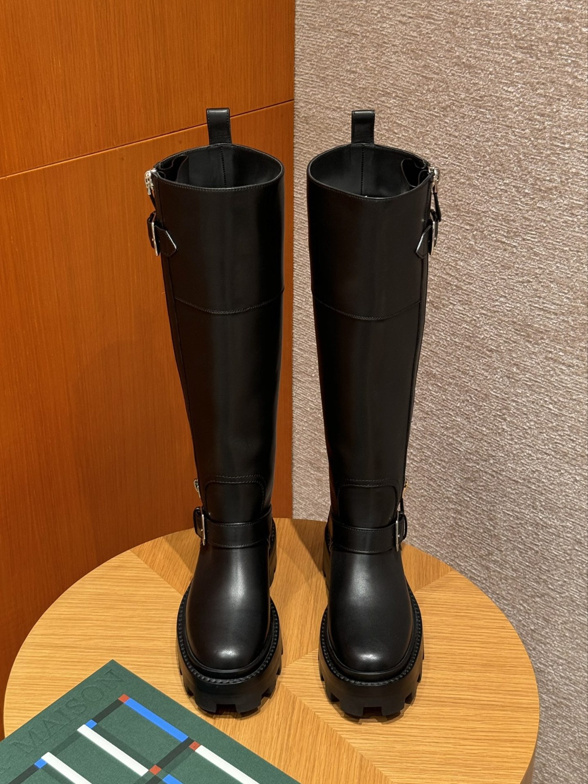 스타일: 제이미 롱부츠 색상: 블랙/누아르 겉감: 송아지 가죽/calfskin 바닥재: 진피대창/더말아웃솔/고무대창/Robber outsole 하드웨어: 실버 버클/Sliver 굽/heel:5cm/속창 미포함 저희 제품은 모두 수작업으로 제작