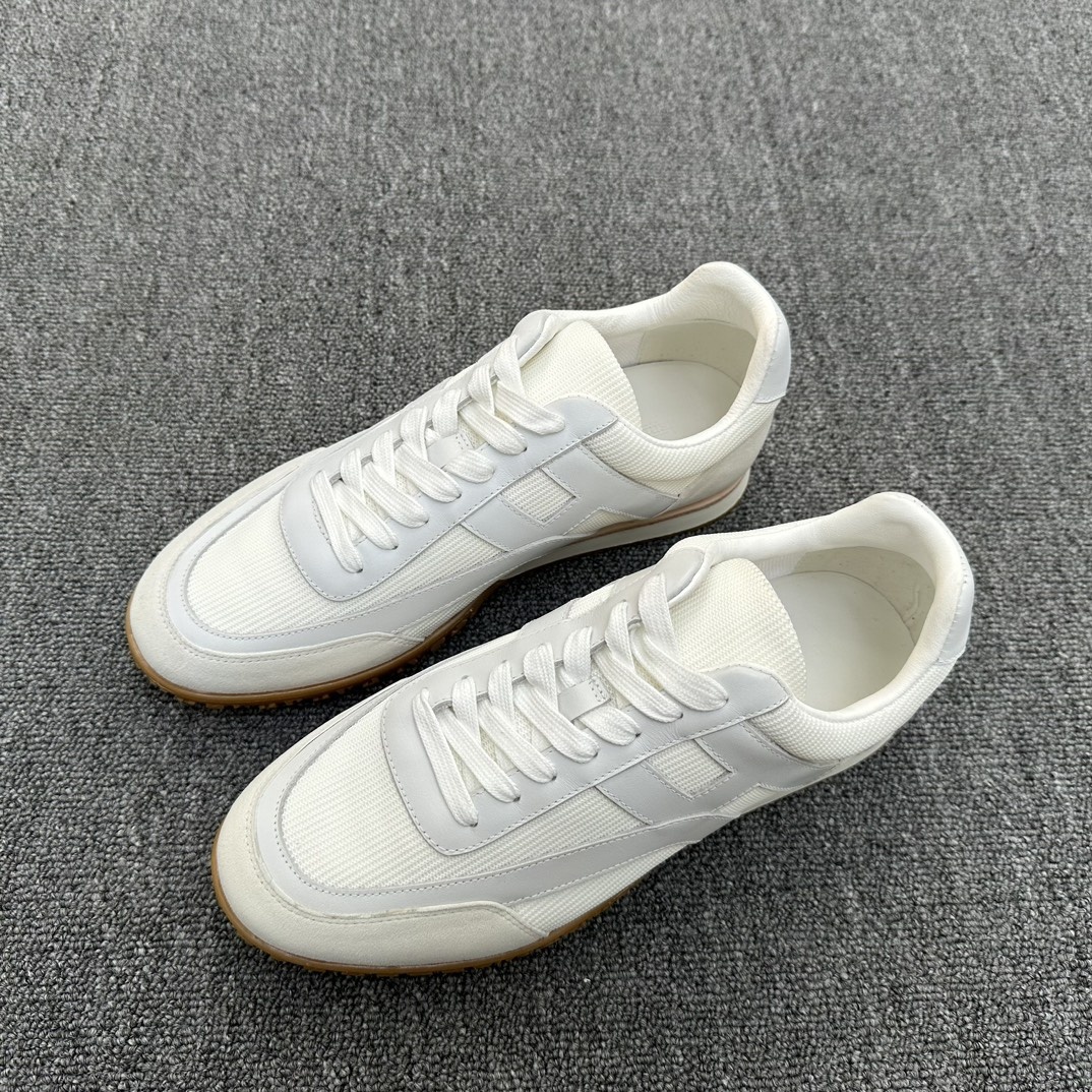 에르메스 남성 스니커즈 신발 표면은 하이테크 에어 메쉬 패브릭과 스웨이드 염소 가죽 컬러 충돌 패턴과 시그니처 H 디테일을 장식했음 아방가르드한 빈티지한 룩을 연출해줌 허니 컬러 러버솔 화이트 러버 중창 뒷창 소가죽 트리밍 네츄럴 컬러의 가죽 라이닝, 스웨이드 안감