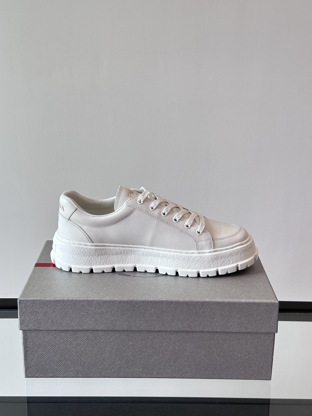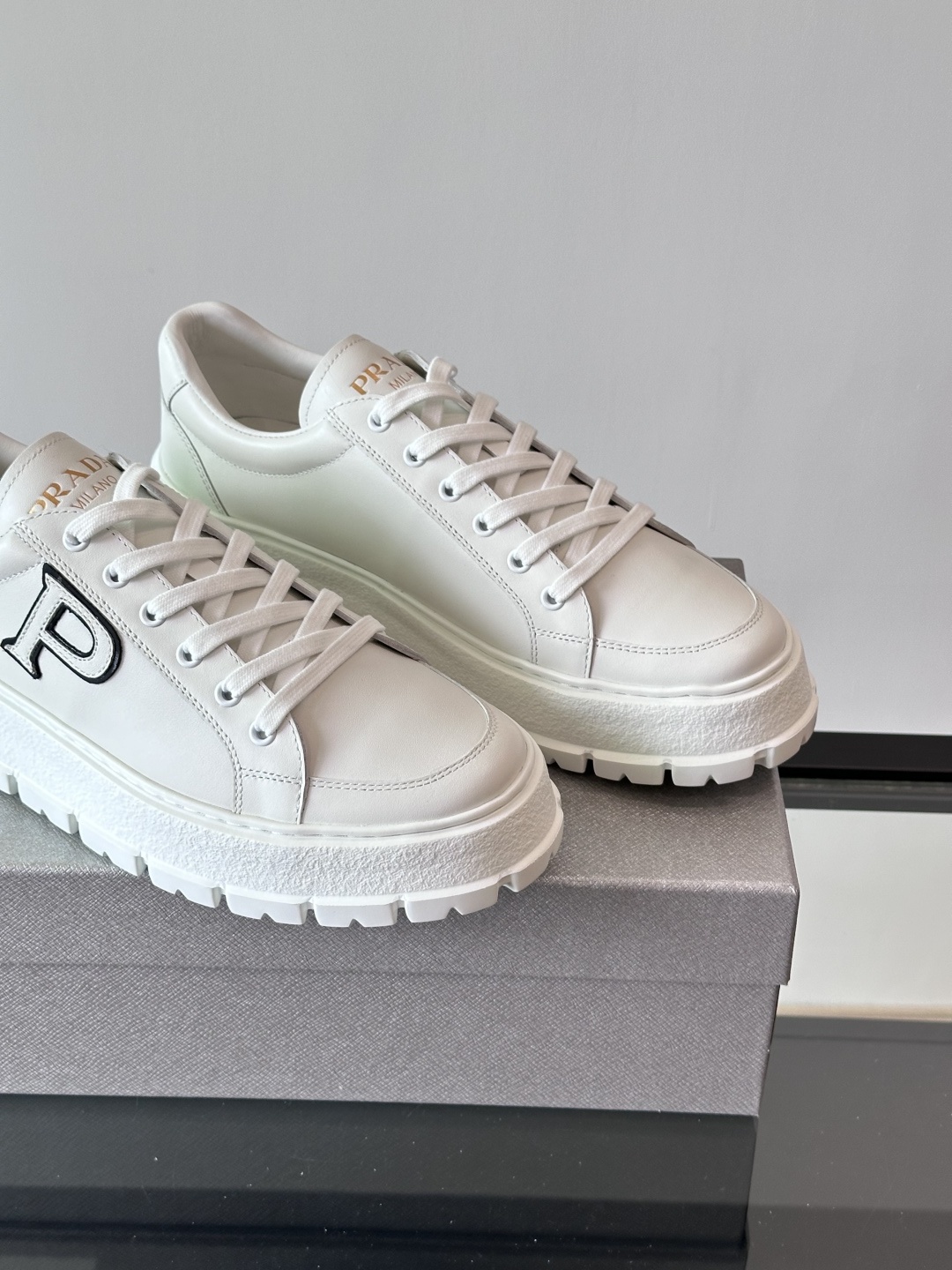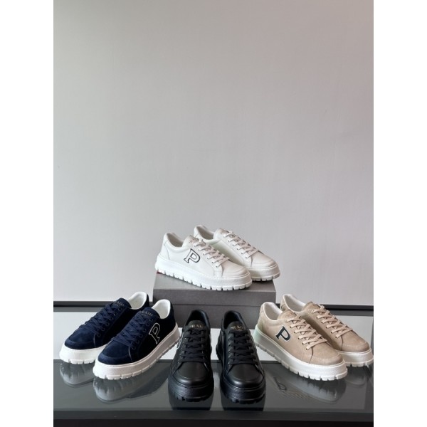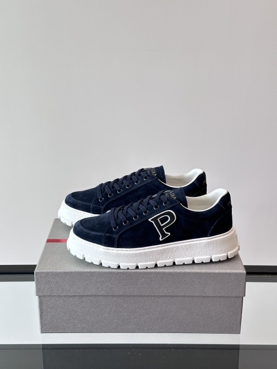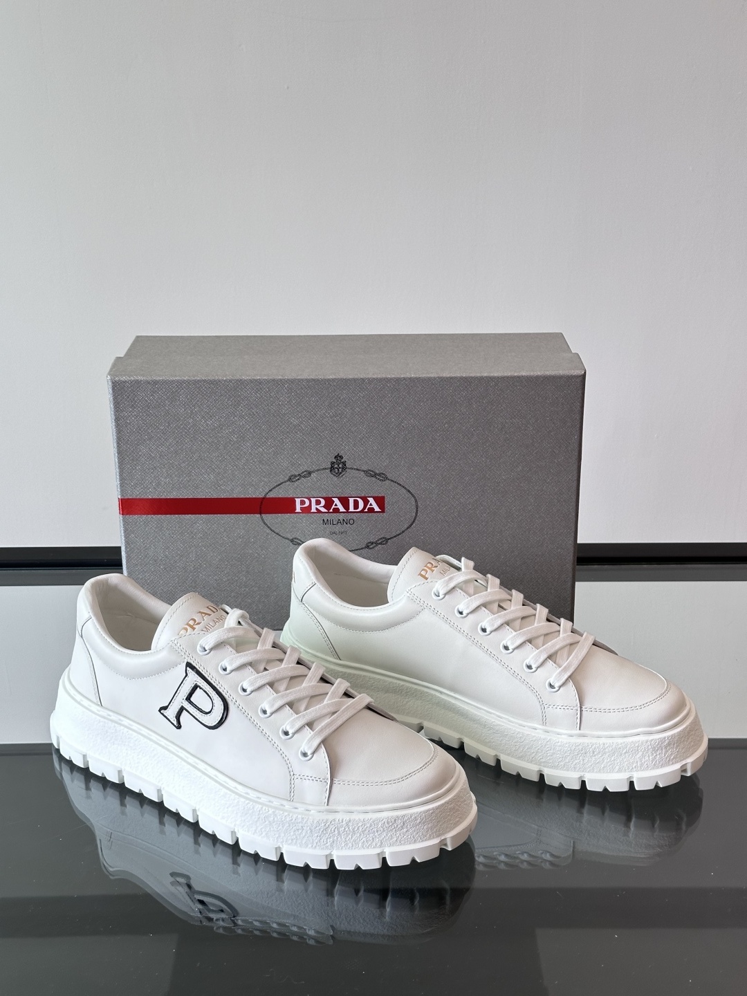프라다 남성 캐주얼 스니커즈 소가죽 슈즈 표면에 4cm 고무창으로 매치하였으며 신발은 브랜드 로고로 장식되어 있어 브랜드 아이덴티티를 설명하지 않아도 됨 발이 부드럽고 가볍고 보기 좋아요