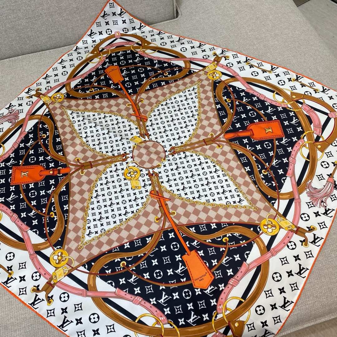 루이비통 MONOGRAM LV LOCKS 90 루이비통과 Georges Vuitton의 디자인을 섬세하게 묘사한 전설적인 하드케이스 버클로, 주얼리와 스터드 테두리로 모노그램 패턴의 배경을 승화시켜 브랜드의 유원한 계보를 이룸 소재 : 100% 실크 size : 90x90cm