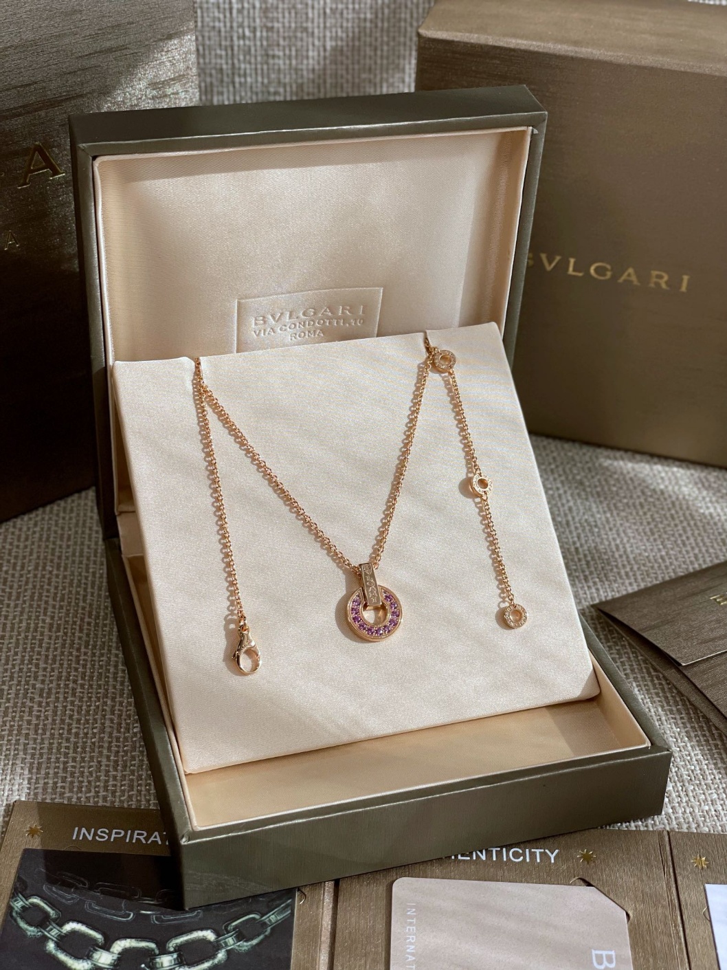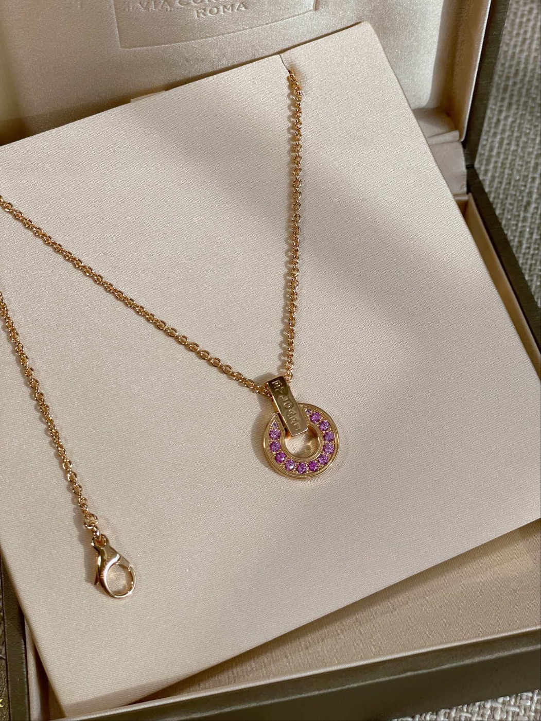 불가리 한정 레드 다이아몬드의 목걸이 BB 컬렉션 목걸이, 중화권 전용 특별판 로마 문화를 바탕으로 전통과 현대의 우아한 조화를 보여줌 클래식한 원형 모티브가 고대 로마의 동전에 새겨진 호 모양의 명문을 연상케 하는 유니크한 펀칭 디자인 핑크 스톤을 세팅하여 심오한 미학과 세련된 보석이 절묘하게 조화를 이룸 ZP33000, 유일하게 리얼모델로 ZP 구매 개발 순은 도금 소재, 수입 하이 카본 큐빅 목걸이 체인 길이 약 38CM, 연장 체인 별도 약 8CM