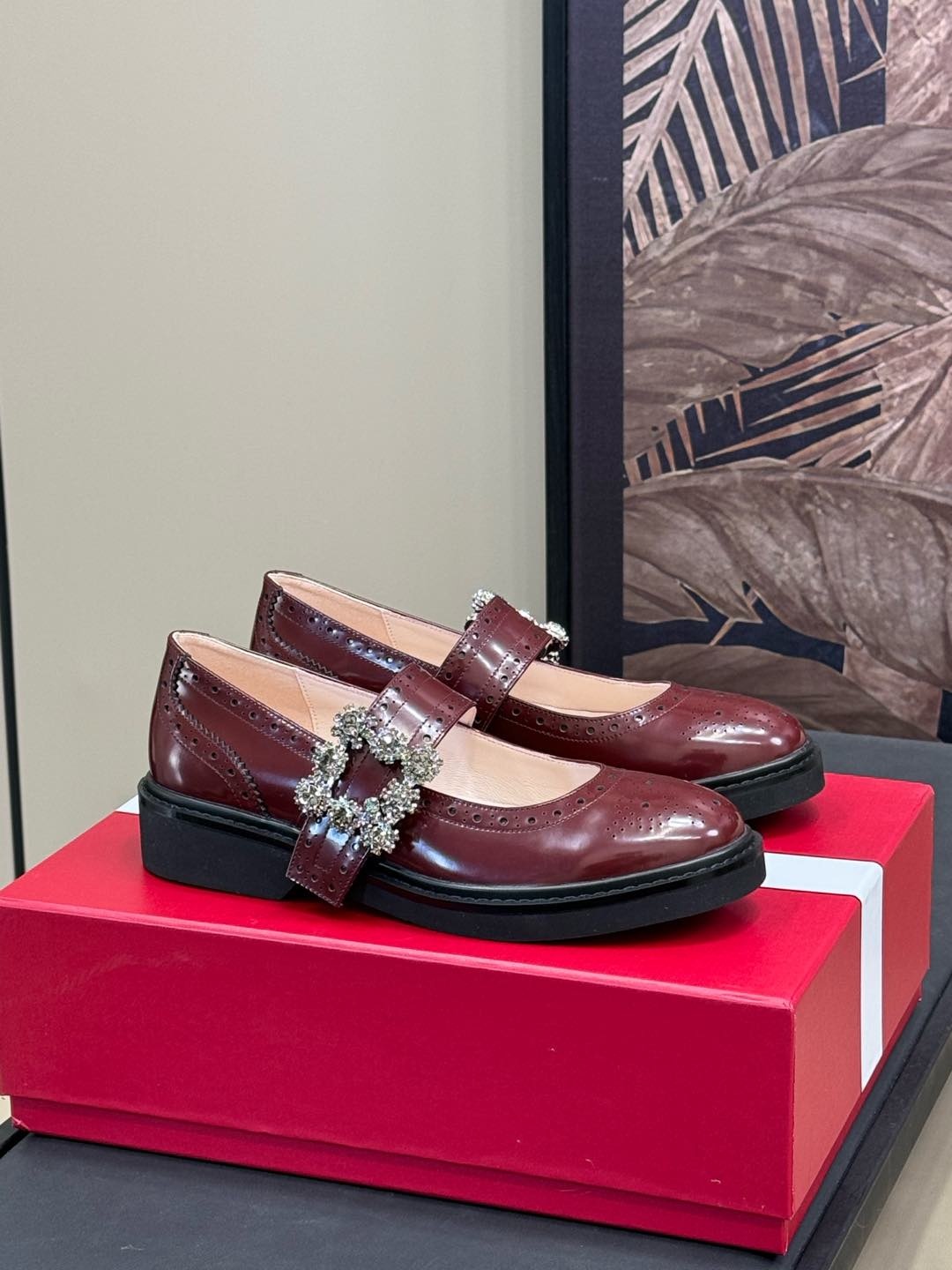 로저비비에 레더 메리제인 슈즈 전통적인 디자인에 도시적이고 세련된 요소를 가미함 반짝이는 가죽으로 제작되었으며 펀칭된 엠보싱이 우아하고 반짝이는 큐빅 버클로 포인트 세련되고 여성스러운 느낌을 줌