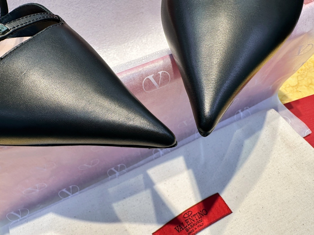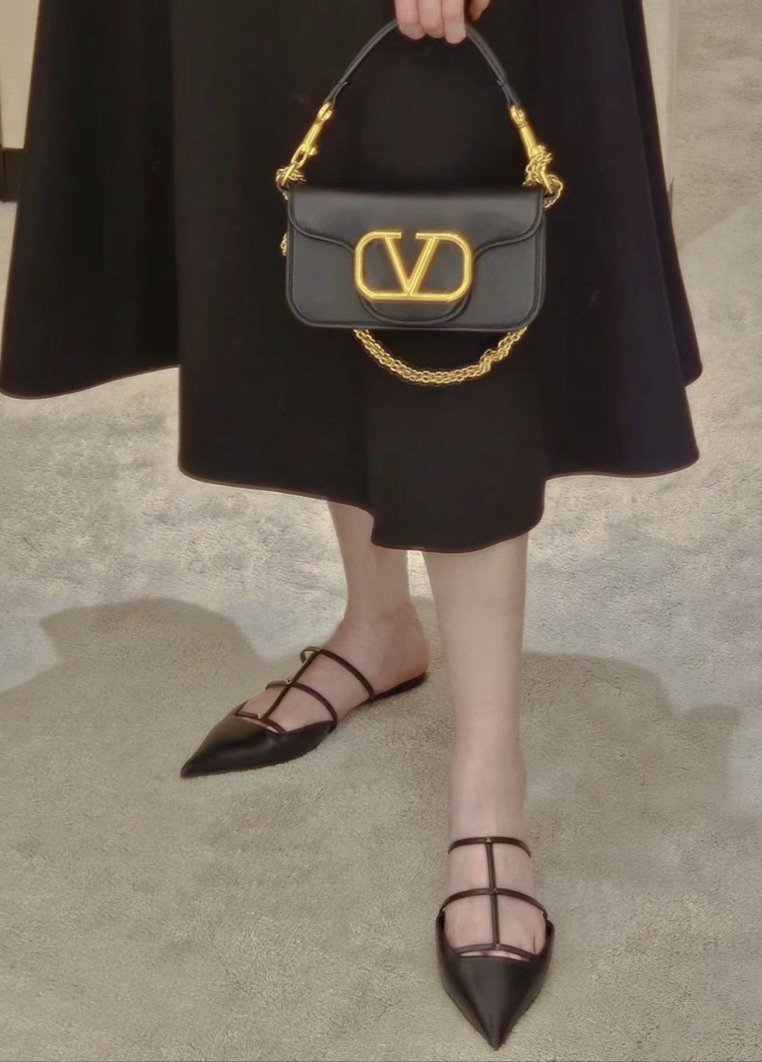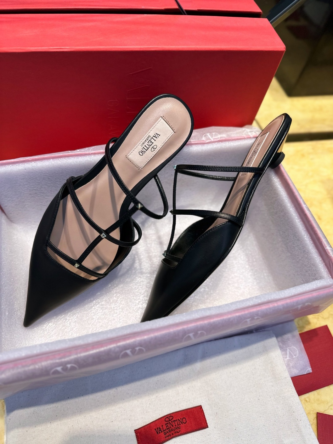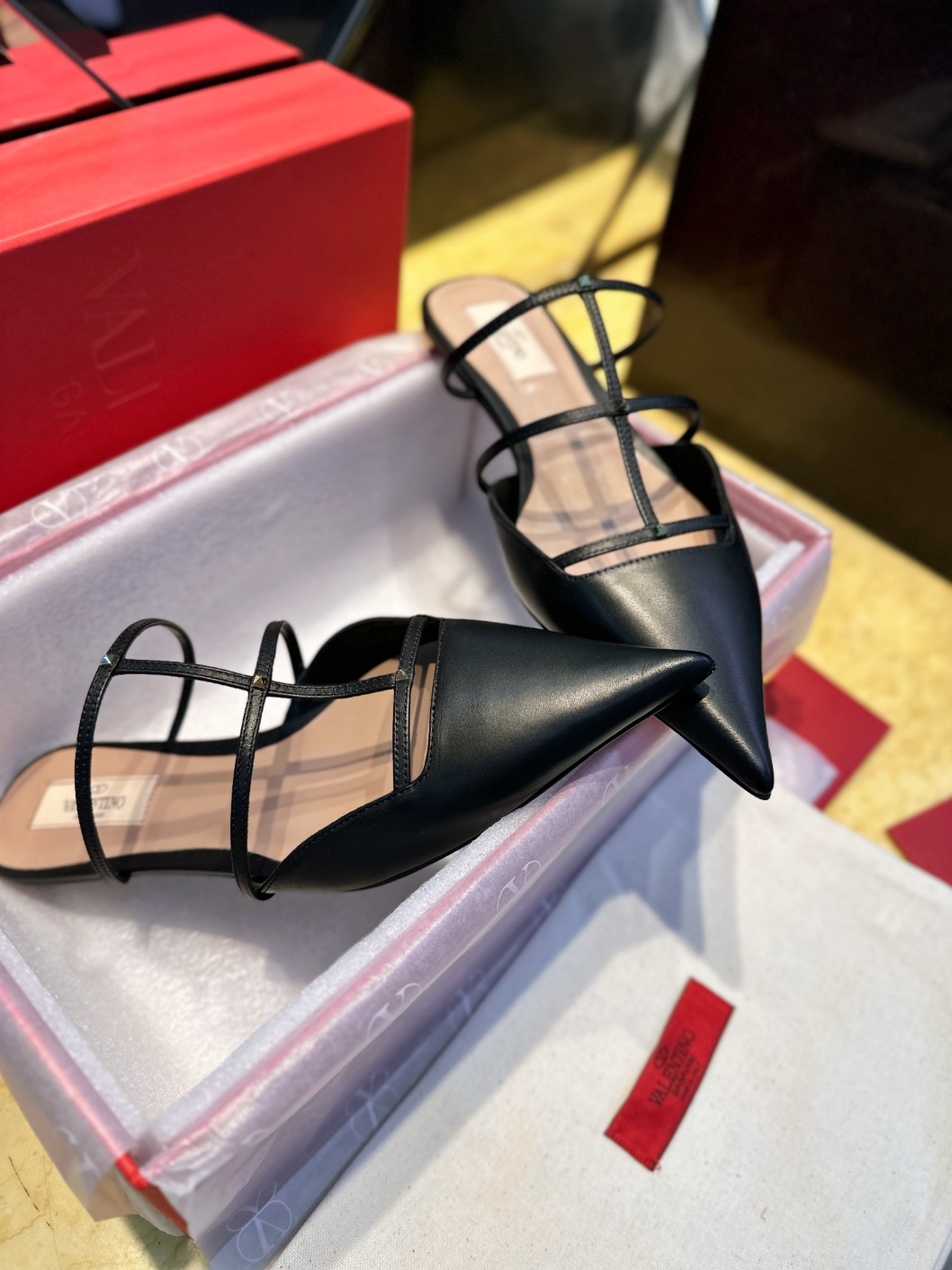 발렌티노 앵클 뮬 슬리퍼 세련되게 뾰족하게 라인이 깔끔하며 세 줄의 미니멀한 스트랩으로 적당한 노출을 연출 앞판 고무 사출 발차기 미끄럼 방지 리얼 가죽 창 우아한 여성스러움의 극치