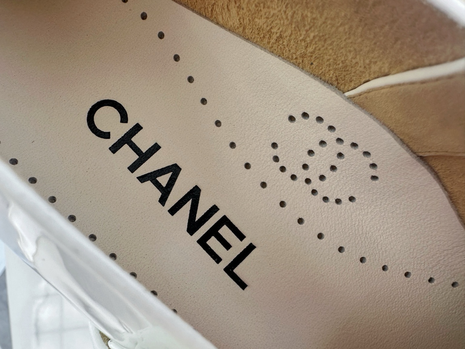 샤넬 23B 화이트 페이턴트 메리제인 바닥 화이트 펄 페이턴트 + 화이트 몰드 콤비 생고무 미끄럼 방지 밑창 + 에나멜 굽으로 질감이 우수하고 군더더기 없이 심플하고 깔끔하며 통통한 밑창 디자인으로 오래 걸어도 전혀 힘들지 않으며 굽 부분에 작은 더블 C로고가 포인트로 멋스러움을 더해줌