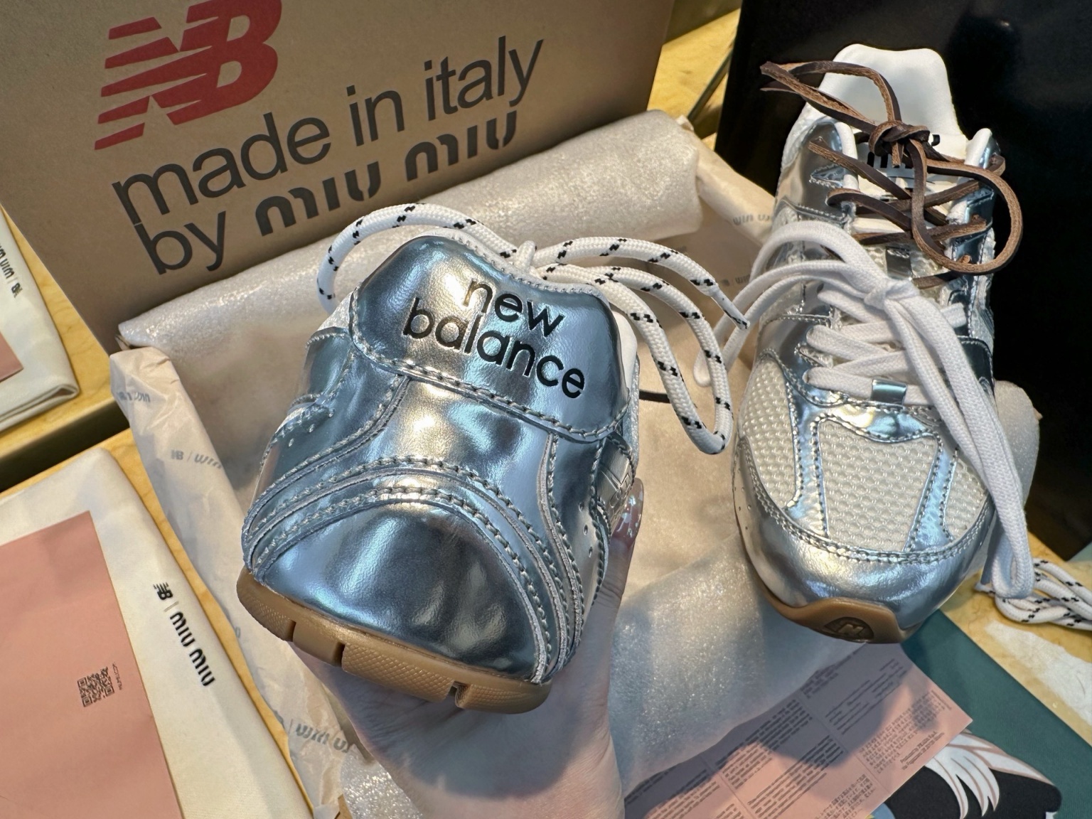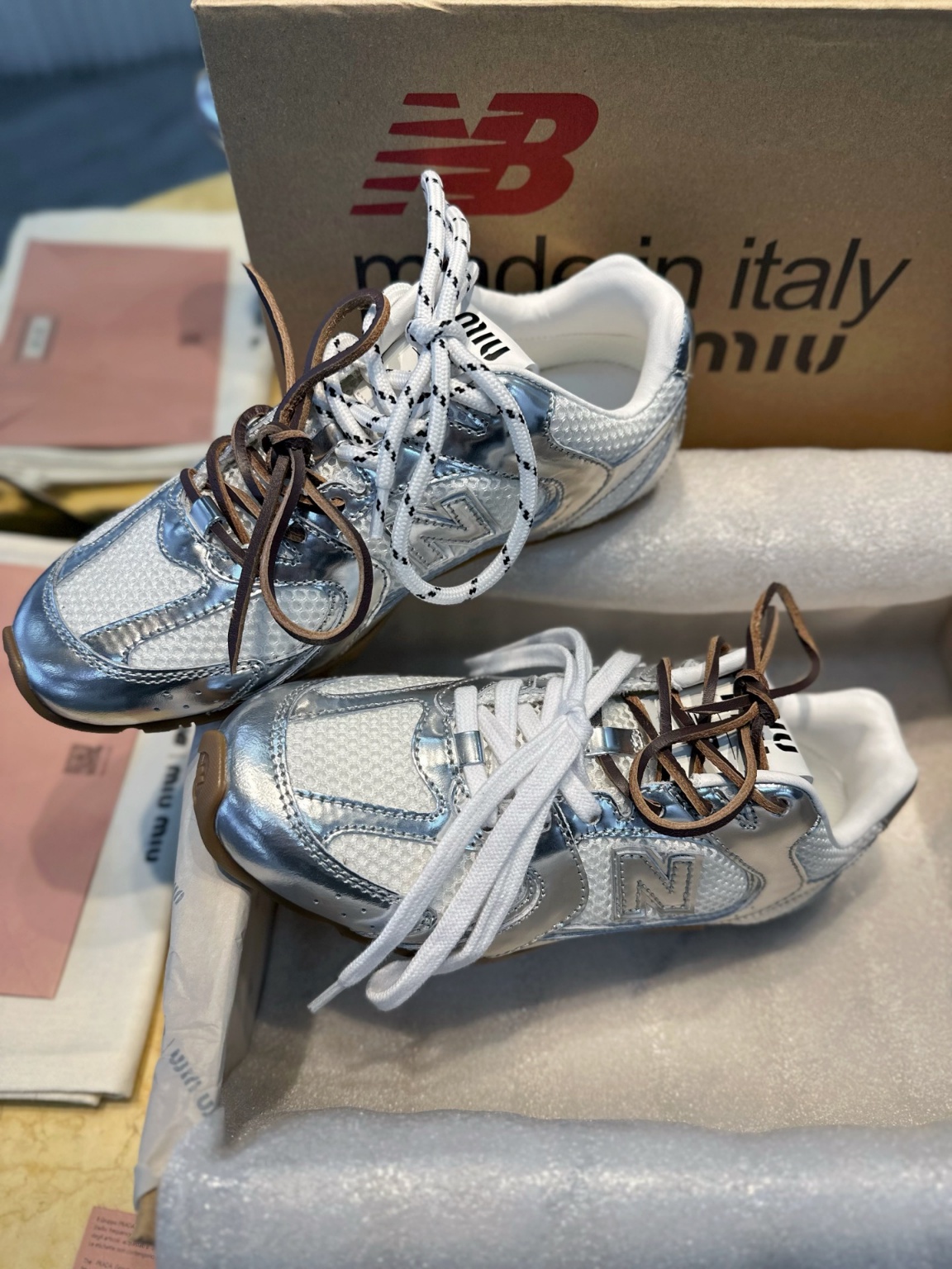 미우미우x뉴발란스 콜라보 스니커즈 리퀴드 실버에 화이트 메쉬, 실버 로고 반짝이는 포인트 디테일로 캐주얼하고 스포티한 느낌을 주며 화이트 브라운 컬러의 스트랩 장식을 매치하여 패션과 클래식을 동시에 느낄 수 있는 아이템으로 다양한 가능성을 열어줌