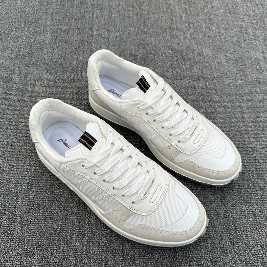 브리오니 크로싱 스니커즈 스웨이드 가죽과 나일론 소재로 핫스탬프 스티치 컬러로 디자인 뒷굽 부위 안감이 튀어나와 발에 감싸는 느낌이 물씬 풍김 배색 포인트로 사이드 끈을 매치하였음 스포티하면서도 트렌디한 스타일은 조거 팬츠나 청바지를 매치하기에 제격 일체형 디자인, 브리오니 스티치 라벨, 콤비네이션 사이드 스트랩 핫 프레스 메모리 고탄성 플렉시블 매트. 투톤 고무 미끄럼 방지 창