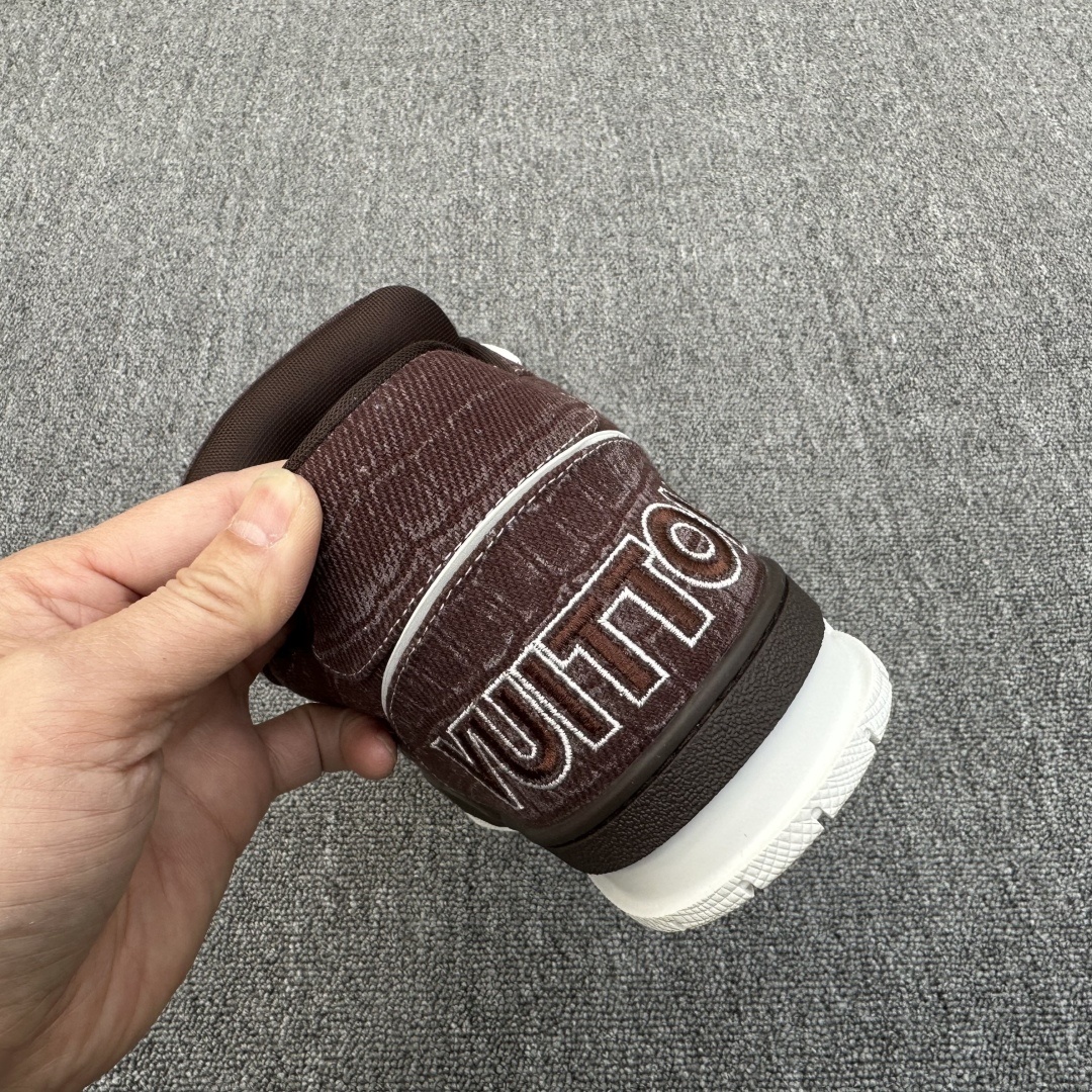 LV Trainer 스니커즈 데님에 악어가죽의 결을 엠보싱하여 빈티지한 농구화를 연출 루이비통의 필기체 로고가 브랜드의 아이덴티티를 확인시켜주며 신발의 앞면과 바깥바닥에 모노그램 꽃을 피우고 그라데이션 스트랩과 조절 가능한 벨크로를 매치 악어가죽 엠보 데님 신발끈/조절 벨크로 신발끈 고무 로고 한 켤레당 7시간 봉제 고무 겉창 포인트 모노그램 플라워