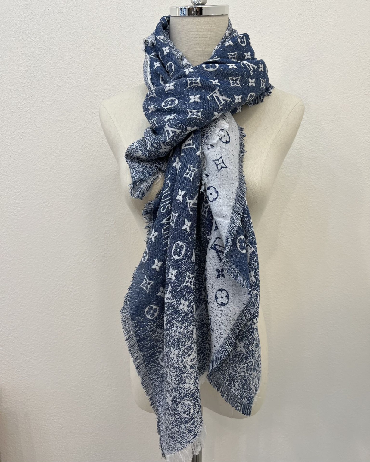 루이비통 데님 Gradient 숄 실크 혼방으로 큰 사이즈로 커팅되어 우아하게 떨어짐 그라데이션 데님 효과로 사랑받는 청바지 톤처럼 상쾌하고 시원한 상체 소재: 면 55%+면 28%+17% 실크 누에고치 Size : 142.5x142.5cm