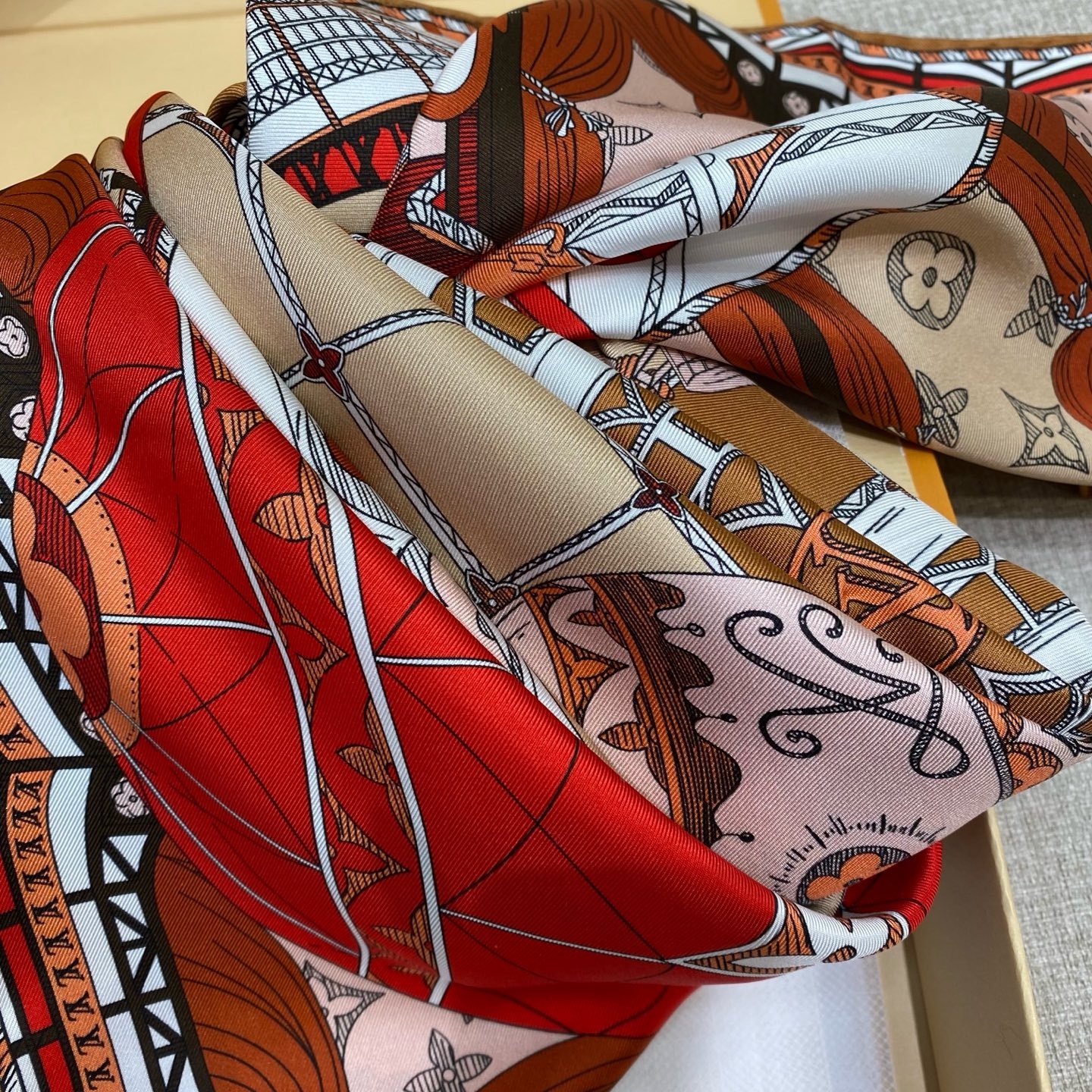 루이비통 FLY AWAY 90 플라이 어웨이 뽕나무 실크 스카프는 환상적인 여행을 재치있게 연출하며 파리 대왕궁 문양에 열기구, 빈티지 비행기 루이비통 전통 하드박스를 접목시켜 브랜드의 여행 전통을 표현해 줌 소재: 100% 실크 size: 90x90cm