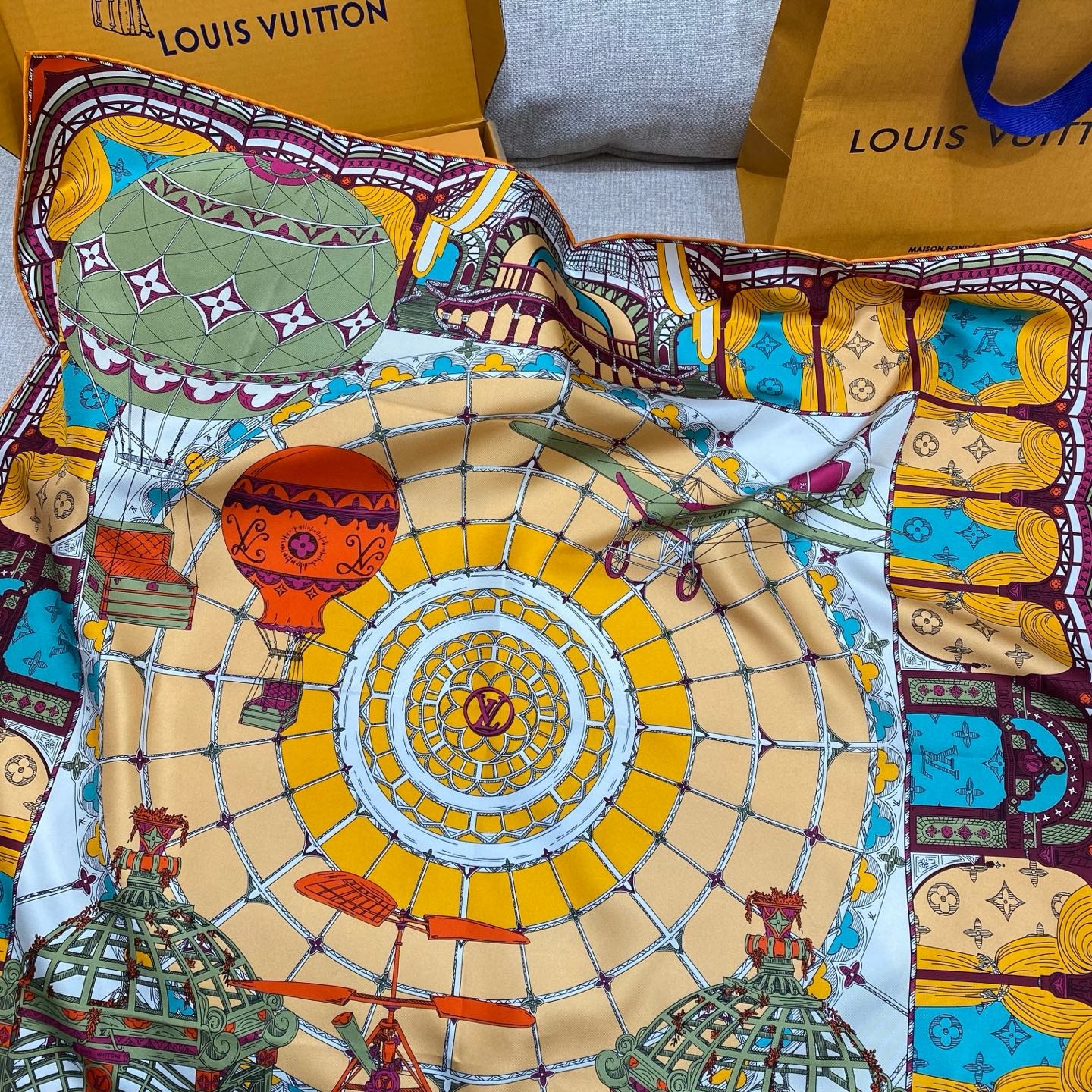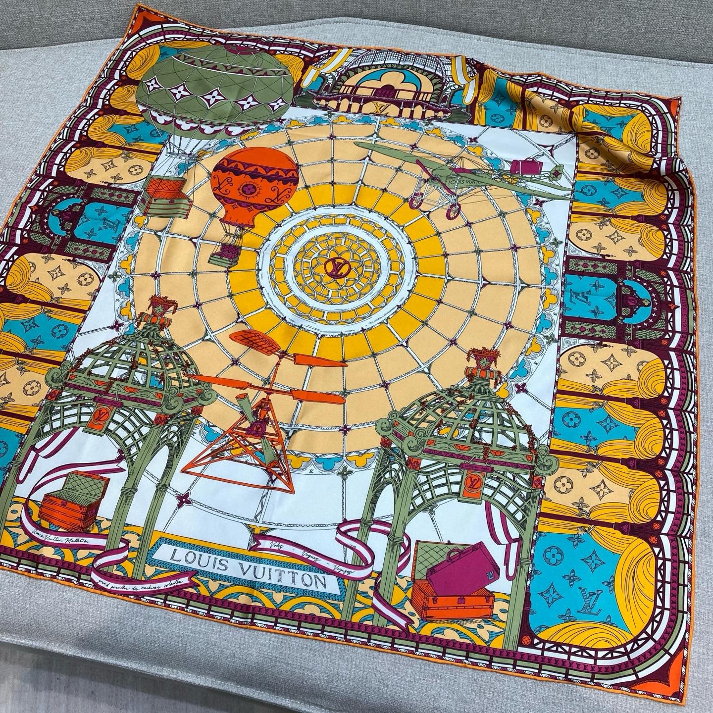 루이비통 FLY AWAY 90 플라이 어웨이 뽕나무 실크 스카프는 환상적인 여행을 재치있게 연출하며 파리 대왕궁 문양에 열기구, 빈티지 비행기 루이비통 전통 하드박스를 접목시켜 브랜드의 여행 전통을 표현해 줌 소재: 100% 실크 size: 90x90cm