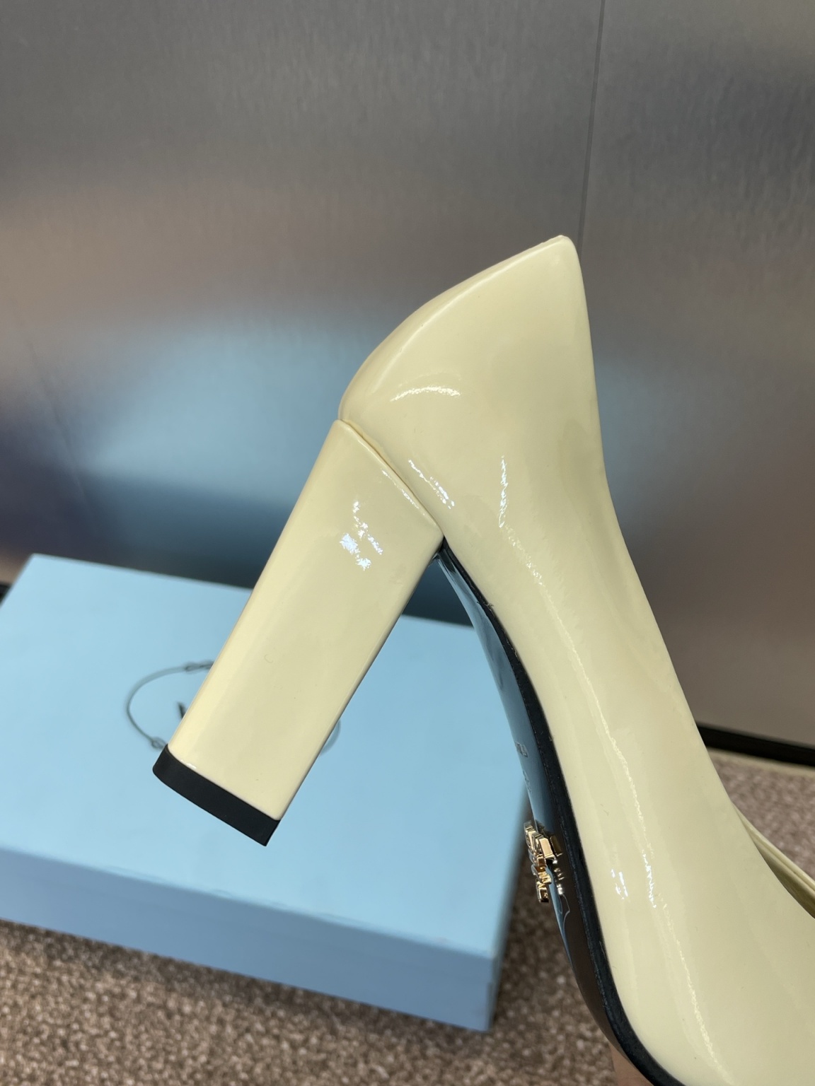 프라다 2025 신상 스퀘어힐 통굽 단화 소재: 바닥 수입 소가죽+물나염 양가죽 안감 이태리 사출 리얼 가죽 창 굽: 8.5CM