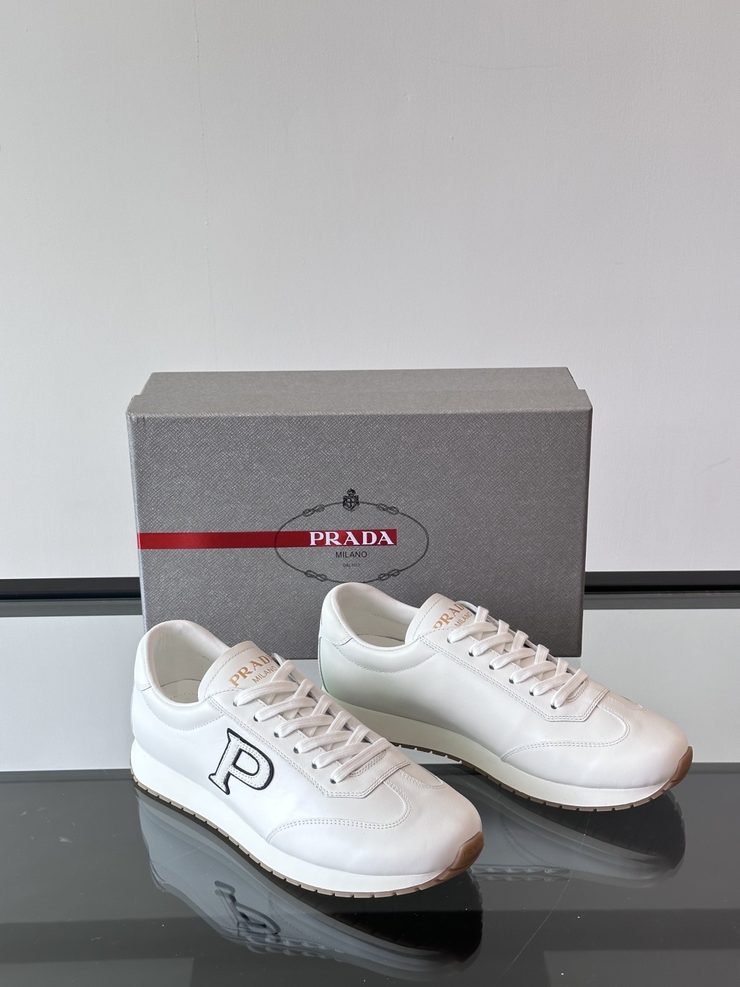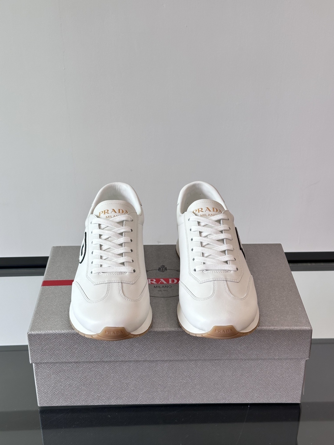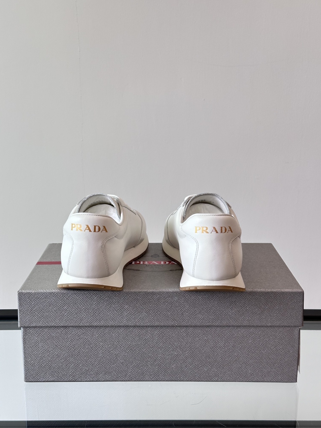 프라다 뉴 레더 스니커즈 시즌1 스트랩 플랫부터 시작해 스트랩 스니커즈까지 매끈하고 고급스러운 신발 스타일링 속은 부드럽고 통기성이 좋으며 내마모성이 좋으며 중창은 원판에 이니셜이 있고, 고탄성형 배반창은 원판에 변형이 없고 발냄새가 나지 않으며, 메모리 스펀지는 원판으로 신발이 통통해 보이고 통기성이 강하며, 착용불변형 TPU성형 대창, 겉감 실크 송아지 안감 혼종 양가죽