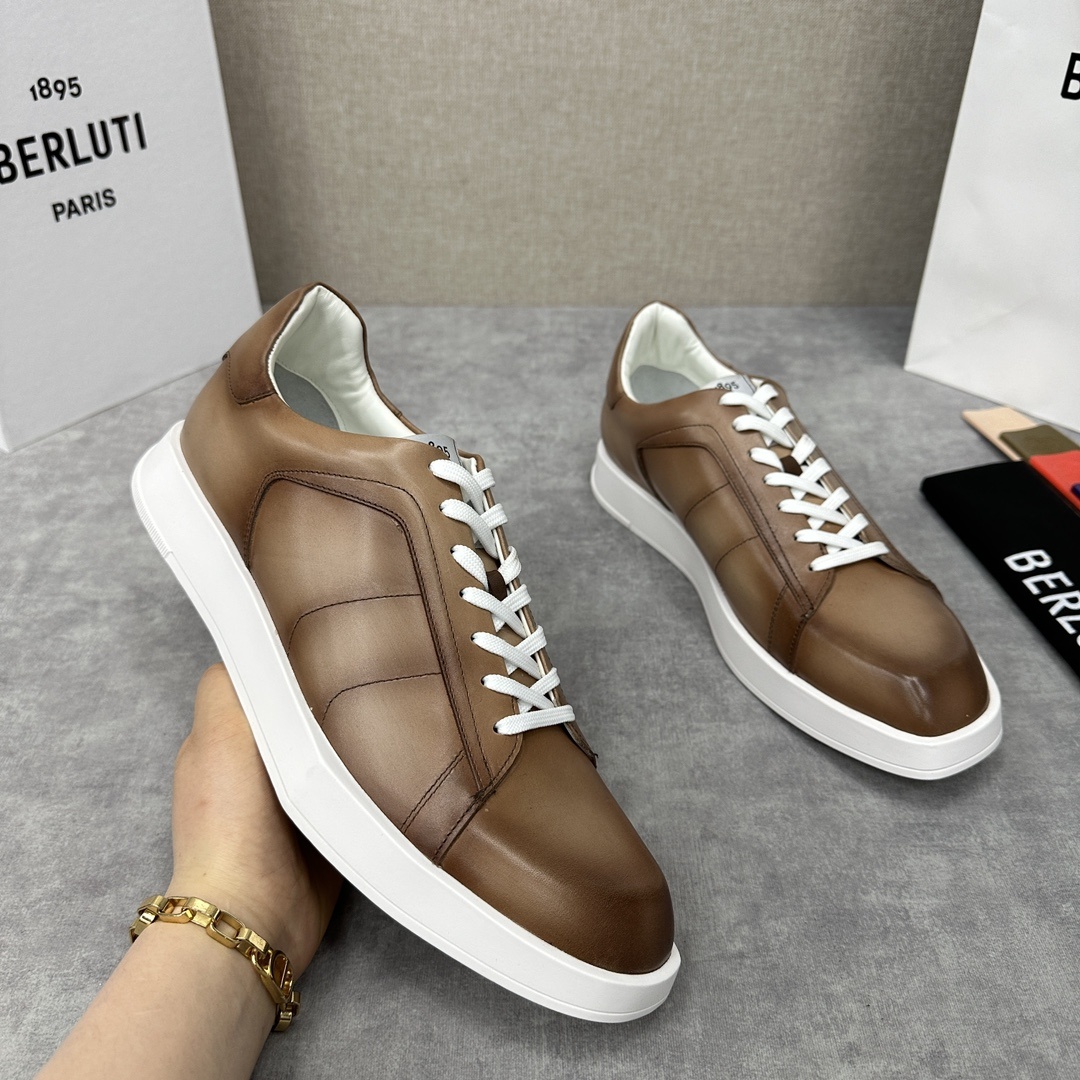 벨루티 Stellar 캐주얼 스니커즈 새로운 다이아몬드 컷팅 신발, 우아하고 아방가르드한 스타일 스텔라 운동화의 신발 골, 가죽 및 독특한 아웃솔이 특징 언밸런스한 줄무늬 Incollato 구조의 패딩 칼라 수입 실크 가죽으로 안감 송아지 가죽과 독립적이고 일체형 활동적인 소가죽 스포티 매트 새로운 Berluti Logo가 새겨져 있으며 굽과 밑창 모두에 브랜드 미니멀 로고 편안한 TPU 고무창 각이 돋보임