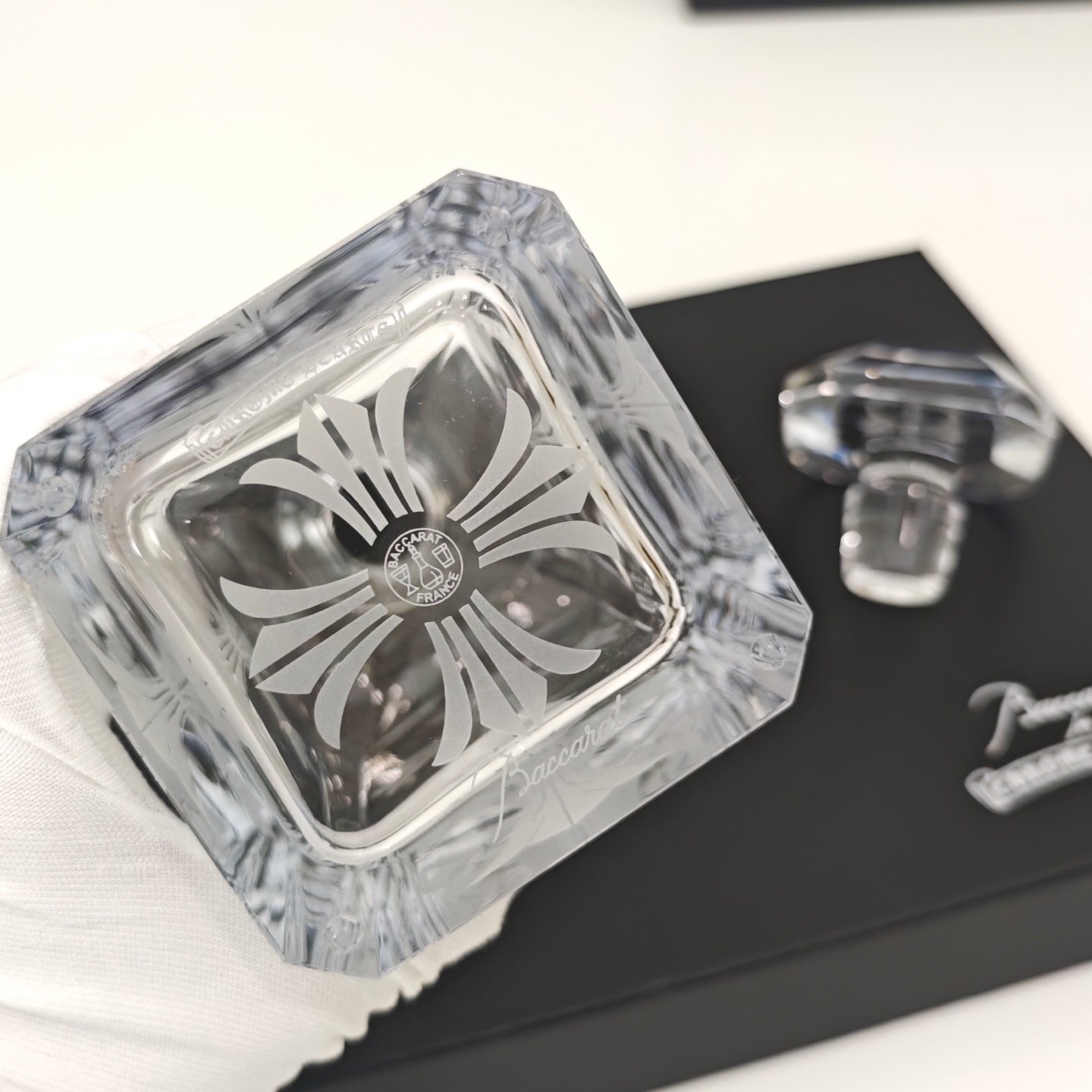 크롬하츠&바카라 콜라보레이션 장인정신 작품 크리스털 와인병, k9 클리어 크리스털로 밀착 커팅하여 빛에 비쳐 투명하고 스타일리시한 분위기와 의식감을 연출하는 핸드 샌드블라스트 레이저 로고 사이즈: 21 x 9cm
