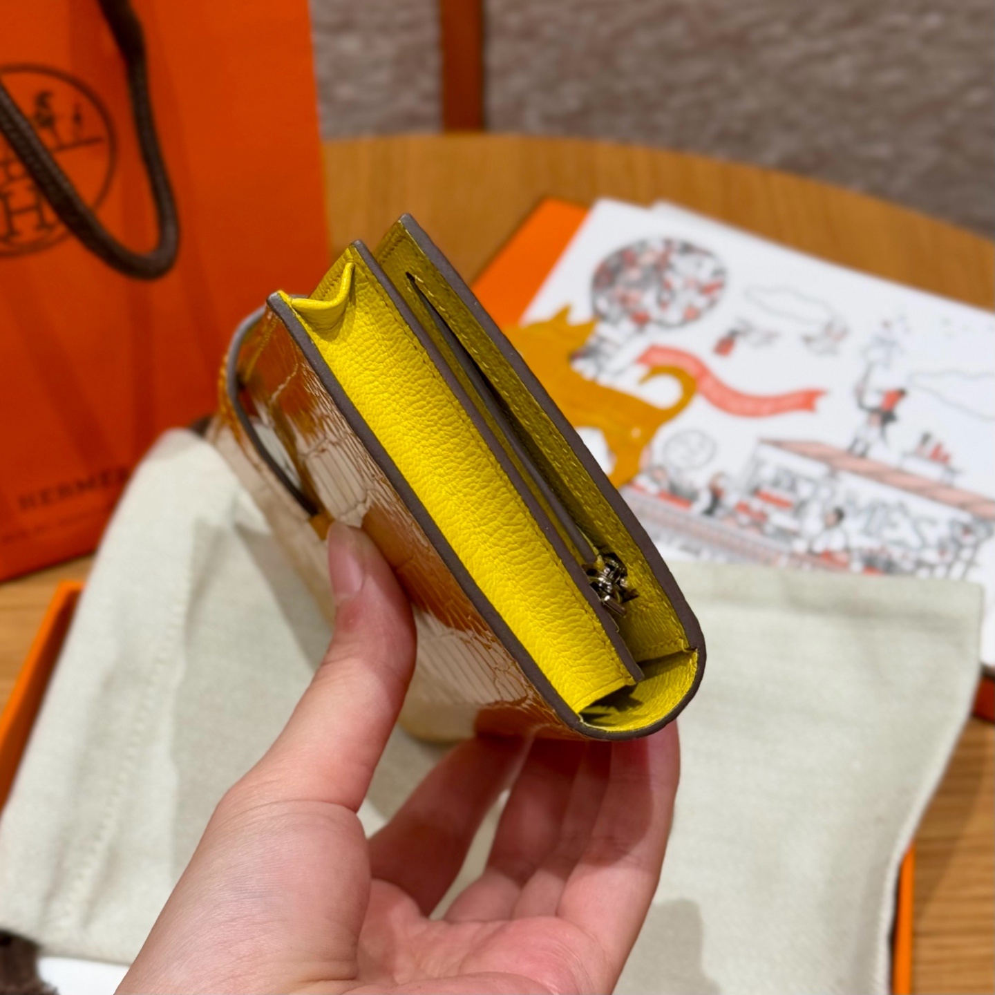 Style:Bearn Colour:9D/Jaune ambre Size:17.5*9*5cm Leather:Bright faced America Alligator Hardware:silver 베안 장지갑, 반짝이는 악어, 엠버 옐로우 실버 버클, 고급스러운 핸드메이드 전용 맞춤 제작 5개의 카드 슬롯, 2개의 포켓, 지퍼 동전 지갑 및 팔라듐 도금 H 버클 주문 실사