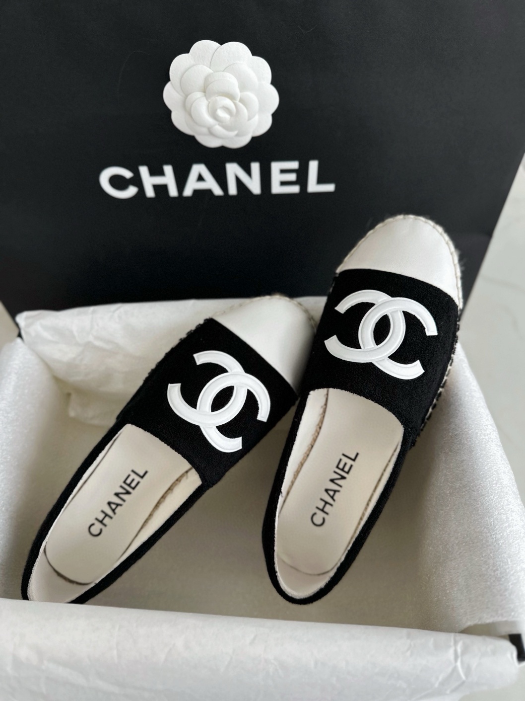 샤넬 24P 흑백테리 캐주얼 에스파듀 대판 대 재료 대 색상, 말문이 막힐 정도 타월 원단으로 촘촘하게 제작되어 앞코가 포화상태이고 더블 로고에도 입체적인 화이트 양가죽으로 멋스럽고 잘 어울리며 생고무창으로 덧발싸개도 가능함