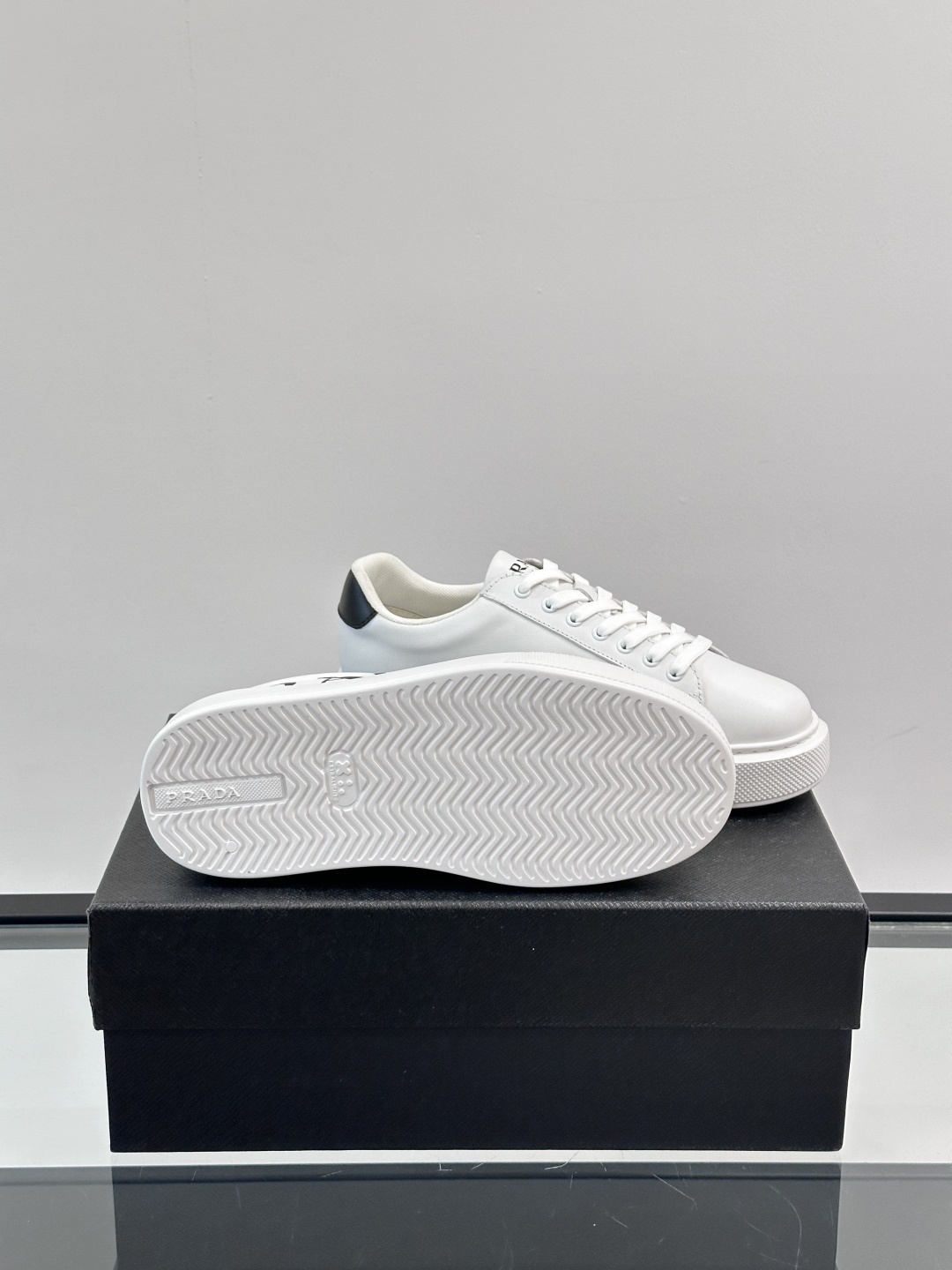 프라다의 새로운 가죽 스니커즈 90년대부터 전통적인 세련된 신발에 주로 사용되던 반짝이는 가죽을 프라다 컬렉션으로 재해석하여 모던하고 심플한 디자인을 완성하였음 믹스매치 스타일을 통해 브랜드의 이원적 특성을 반영하고 있음 송아지 가죽 앞면에 프라다 레터링 빅 로고 혀와 뒷굽에 프라다 레터링 로고 면 안감 소가죽 패드, 스트라이프 고무창으로 가볍고 편안한 발놀림