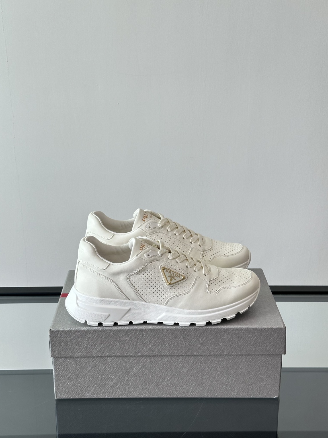 프라다 남성용 새로운 스니커즈 겉면에 수입 송아지 가죽을 사용했음 바깥쪽에는 클래식한 메탈 삼각 에나멜 로고 리얼 가죽 안감, 징검다리 소가죽 바닥에는 미끄럼 방지 스포츠 전용 로고 러버가 적용
