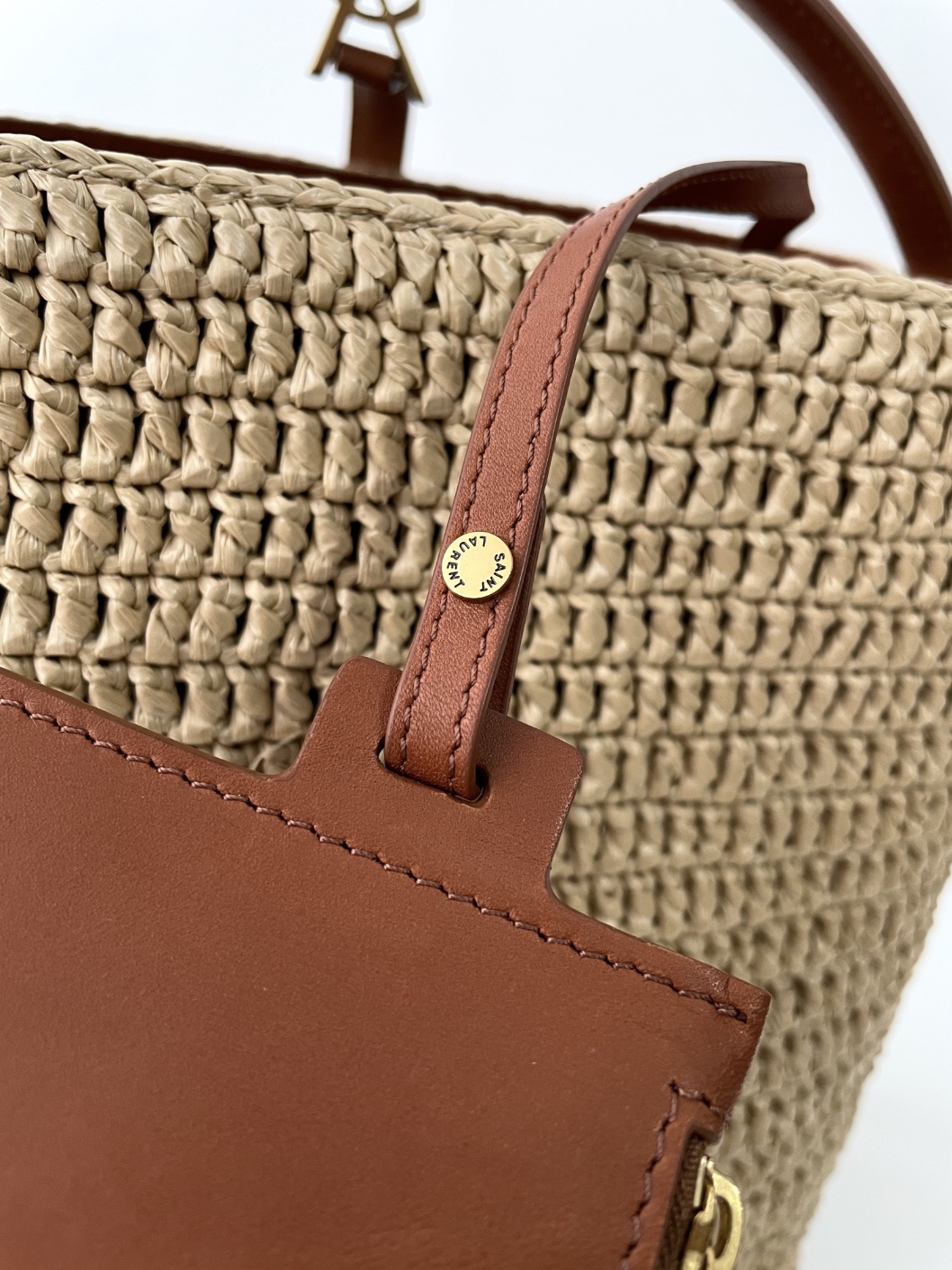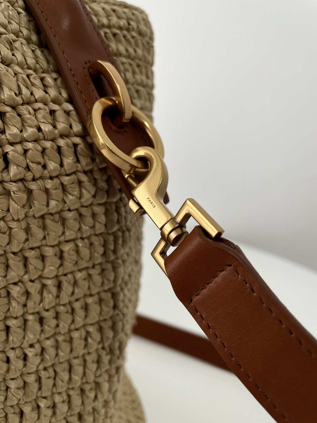 생로랑 LE37 위빙 라피아 버킷백 라피아와 버킷백의 만남 완벽한 조합 ysl 2024 위빙 밀짚 버킷백 라피아와 베지터블 가죽 패치 LE CASSANDRE 후크 여밈, 탈부착 가능한 스트랩 조절 등 다양한 방법으로 느슨함을 극대화시켜 하와이안 룩을 완성 여름 바캉스 여행 필수, 힙스터 필수 모델명: 773991 사이즈: 20x25x16cm